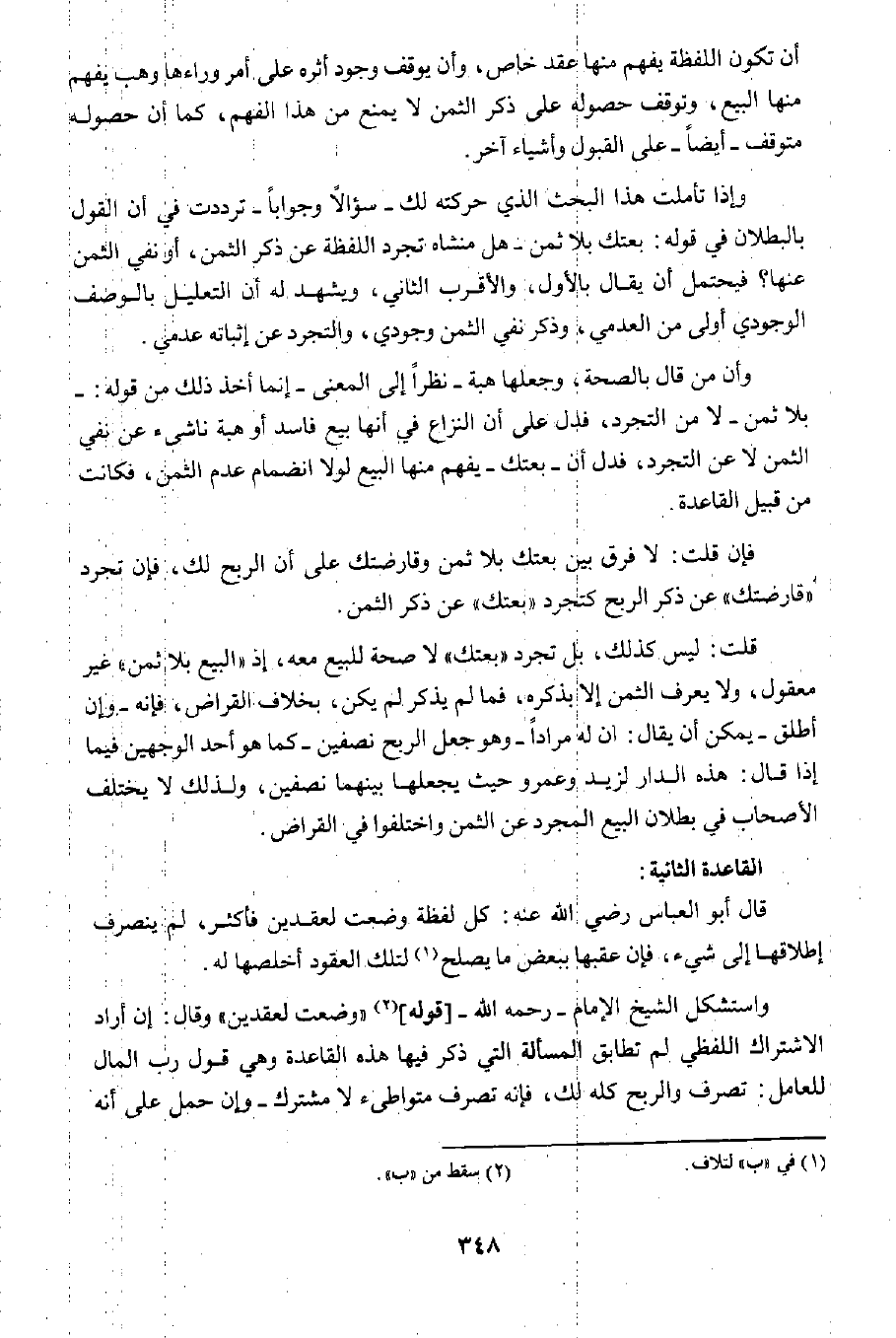 وإذا تأملت هذا البحث الذي حركته لك -سؤالا وجوابا- ترددت في أن القول بالبطلان في قوله: بعتك بلا ثمن -هل منشاه تجرد اللفظة عن ذكر الثمن، أو نفي الثمن عنها؟ فيحتمل أن يقال بالأول، والأقرب الثاني، ويشهد له أن التعليل بالوصف الوجودي أولى من العدمي، وذكر نفي الثمن وجودي، والتجرد عن إثباته عدمي.