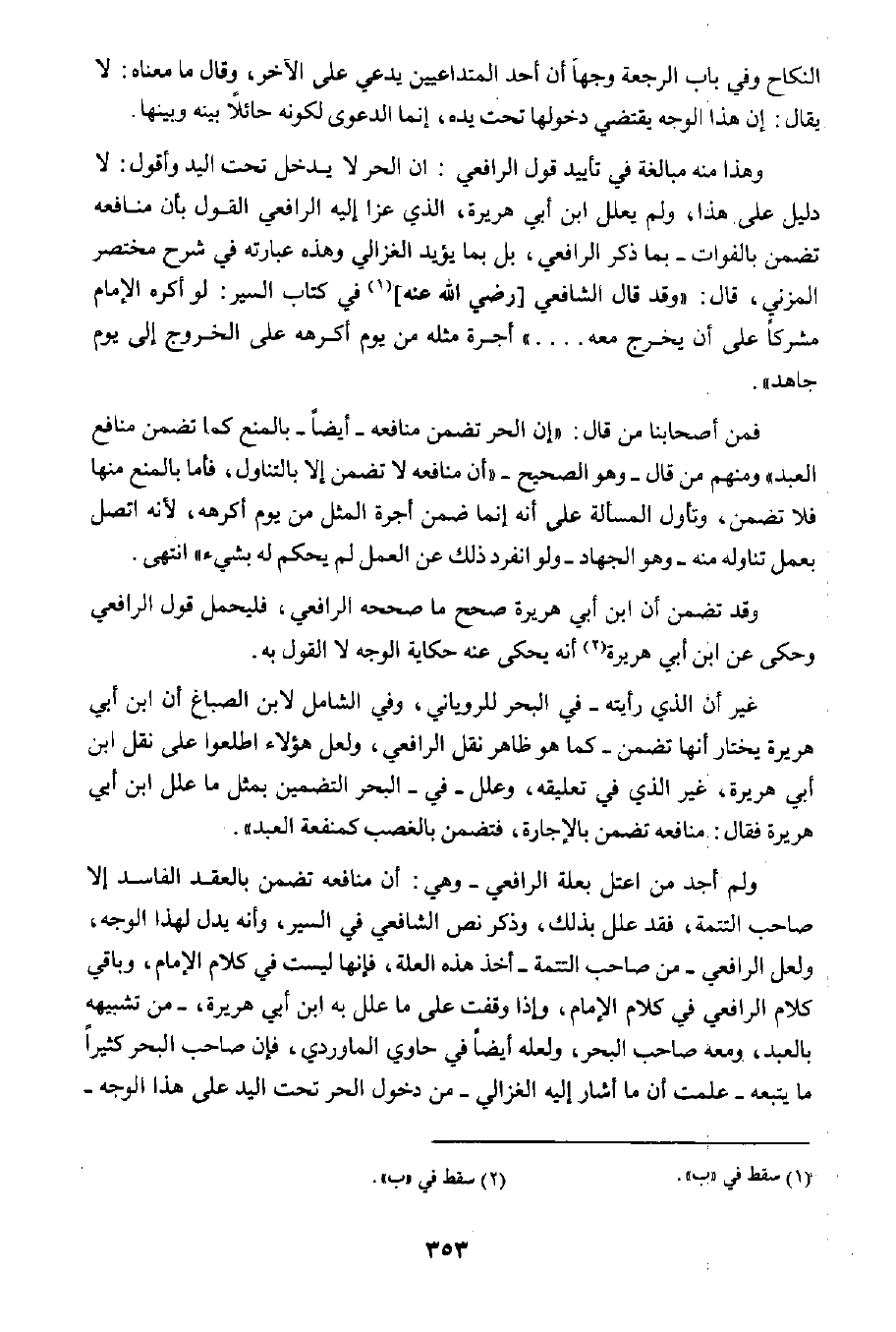 ولم أجد من اعتل بعلة الرافعي -وهي: أن منافعه تضمن بالعقد الفاسد إلا صاحب التتمة؛ فقد علل بذلك، وذكر نص الشافعي في السير، وأنه يدل لهذا الوجه، ولعل الرافعي -من صاحب التتمة- أخذ هذه العلة؛ فإنها ليست في كلام الإمام، وباقي كلام الرافعي في كلام الإمام، وإذا وقفت على ما علل به ابن أبي هريرة، من تشبيهه بالعبد، ومعه صاحب البحر، ولعله أيضا في حاوي الماوردي؛ فإن صاحب البحر كثيرا ما يتبعه -علمت أن ما أشار إليه الغزالي -من دخول الحر تحت اليد على هذا الوجه-