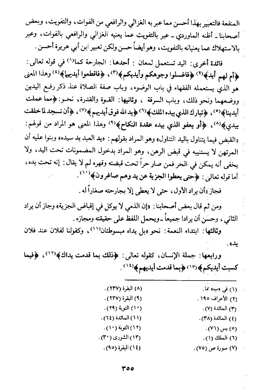 فائدة أخرى: اليد تستعمل لمعان: أحدها: الجارحة كما١ في قوله تعالى: {أَمْ لَهُمْ أَيْدٍ} ٢ {فَاغْسِلُوا وُجُوهَكُمْ وَأَيْدِيَكُمْ} ٣، {فَاقْطَعُوا أَيْدِيَهُمَا} ٤، وهذا المعنى هو الذي يستعمله الفقهاء في باب الوضوء، وباب صفة الصلاة عند ذكر رفع اليدين ووضعهما ونحو ذلك، وباب السرقة، وثانيها: القوة والقدرة، نحو: {مِمَّا عَمِلَتْ أَيْدِينَا} ٥، {تَبَارَكَ الَّذِي بِيَدِهِ الْمُلْكُ} ٦، {يَدُ اللَّهِ فَوْقَ أَيْدِيهِمْ} ٧، {أَنْ تَسْجُدَ لِمَا خَلَقْتُ بِيَدَيَّ} ٨، {أَوْ يَعْفُوَ الَّذِي بِيَدِهِ عُقْدَةُ النِّكَاحِ} ٩ وهذا المعنى هو المراد من قولهم: "القبض فيما يتناول باليد التناول" وهو المراد بقولهم: "يد العبد يد سيده" وبنوا عليه أن المرتهن لا يستنيبه في قبض الرهن، وهو المراد بدخول المضمونات تحت اليد، ولا يخفى أنه يمكن في الحر؛ فمن صار حرا تحت قبضته وقهره لم لا يقال: إنه تحت يده، أما قوله تعالى: {حَتَّى يُعْطُوا الْجِزْيَةَ عَنْ يَدٍ وَهُمْ صَاغِرُونَ} ١٠.