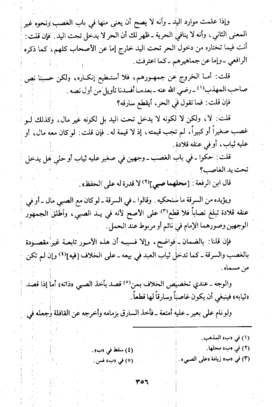 ويؤيده من السرقة ما سنحكيه. وقالوا -في السرقة- لو كان مع الصبي مال، أو في عنقه قلادة تبلغ نصابا فلا قطع٣ على الأصح لأنه في يد الصبي، وأطلق الجمهور الوجهين وصورهما الإمام في نائم أو مربوط عند الحمل.