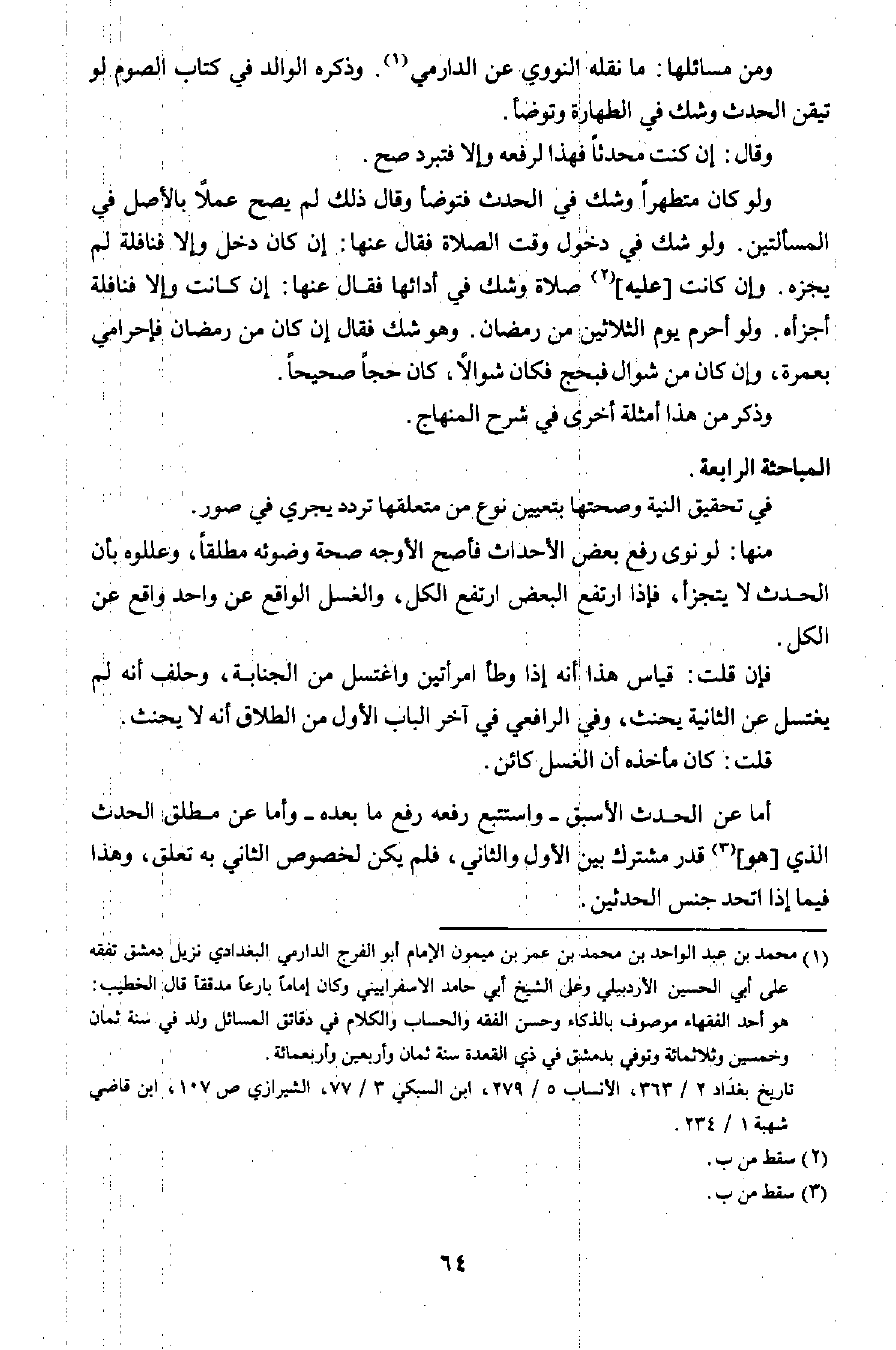 ومن مسائلها: ما نقله النووي عن الدارمي١. وذكره الوالد في كتاب الصوم لو تيقن الحدث وشك في الطهارة وتوضأ.