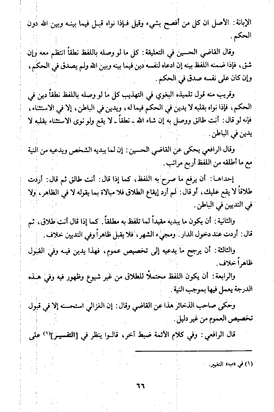 وقريب منه قول تلميذه البغوي في التهذيب كل ما لو وصله باللفظ نطقا دين في الحكم؛ فإذا نواه بقلبه لا يدين في الحكم فيما له، ويدين في الباطن؛ إلا في الاستثناء؛ فإنه لو قال: أنت طالق ووصل به إن شاء الله -نطقا- لا يقع ولا نوى الاستثناء بقلبه لا يدين في الباطن.