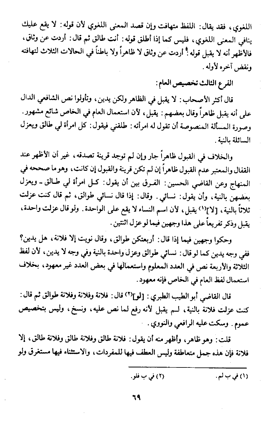قال أكثر الأصحاب: لا يقبل في الظاهر ولكن يدين، وتأولوا نص الشافعي الدال على أنه يقبل ظاهرا وقال بعضهم: يقبل؛ لأن استعمال العام في الخاص شائع مشهور. وصورة المسألة المنصوصة أن تقول له امرأته: طلقني فيقول: كل امرأة لي طالق ويعزل السائلة بالنية.