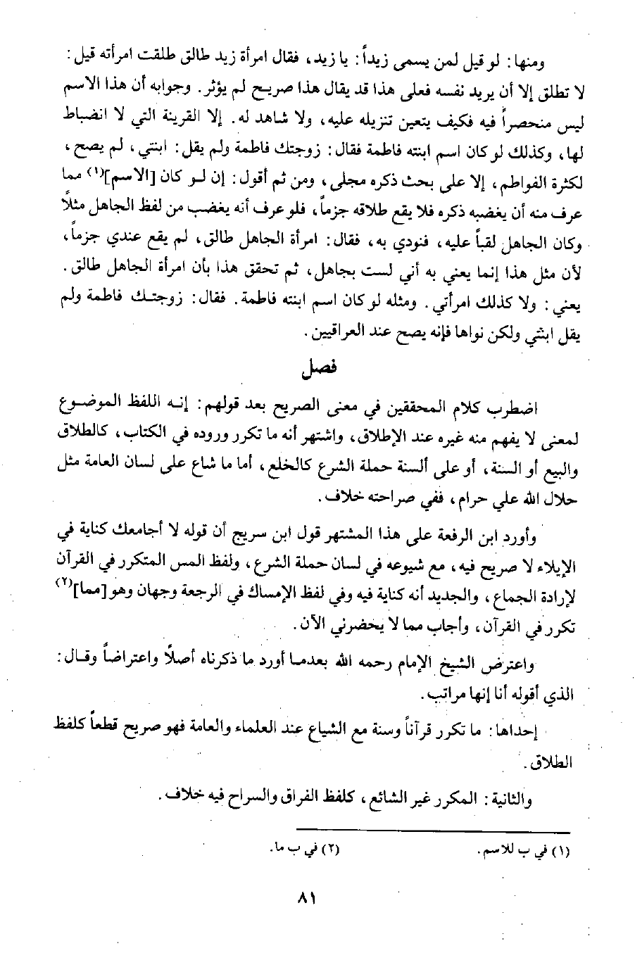 إحداها: ما تكرر قرآنا وسنة مع الشياع عند العلماء والعامة فهو صريح قطعا كلفظ الطلاق.