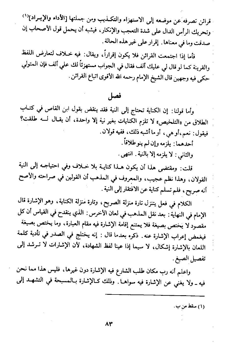 الكلام في فعل يتنزل تارة منزلة الصريح، وتارة منزلة الكناية، وهو الإشارة قال الإمام في النهاية: بعد نقل المذهب في لعان الأخرس: الذي ينقدح في القياس أن كل مقصود لا يختص بصيغة فلا يمتنع إقامة الإشارة فيه مقام العبارة، وما يختص بصيغة فيغمض إعراب الإشارة عنه؛ ذكره بعدما قال: إنه يختلج في الصدر في تأدية كلمة اللعان بالإشارة إشكال؛ لا سيما إذا عينا لفظ الشهادة؛ لأن الإشارات لا ترشد إلى تفصيل الصيغ.