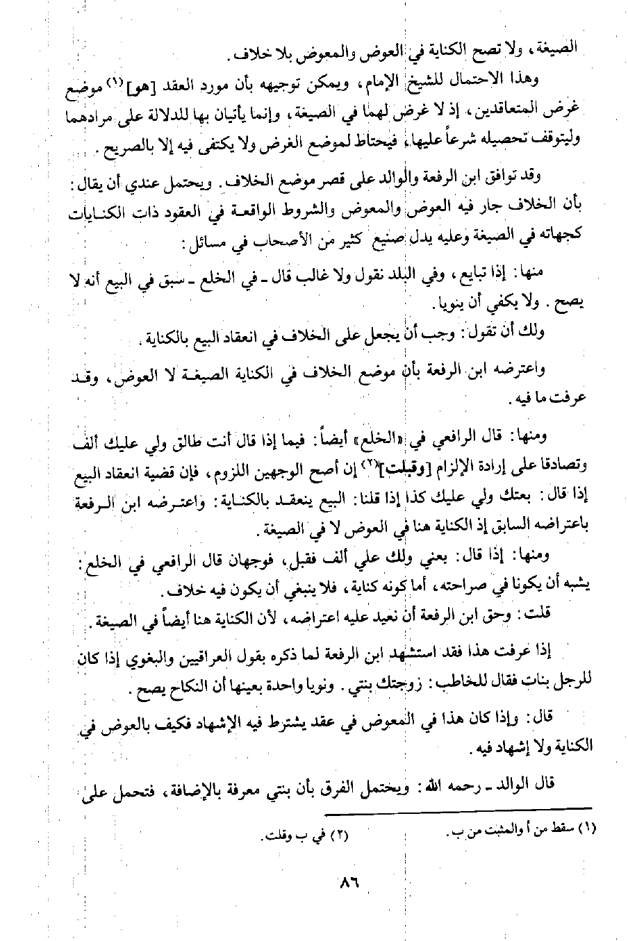 وقد توافق ابن الرفعة والوالد على قصر موضع الخلاف. ويحتمل عندي أن يقال: بأن الخلاف جار فيه العوض والمعوض والشروط الواقعة في العقود ذات الكنايات كجهاته في الصيغة وعليه يدل صنيع كثير من الأصحاب في مسائل: