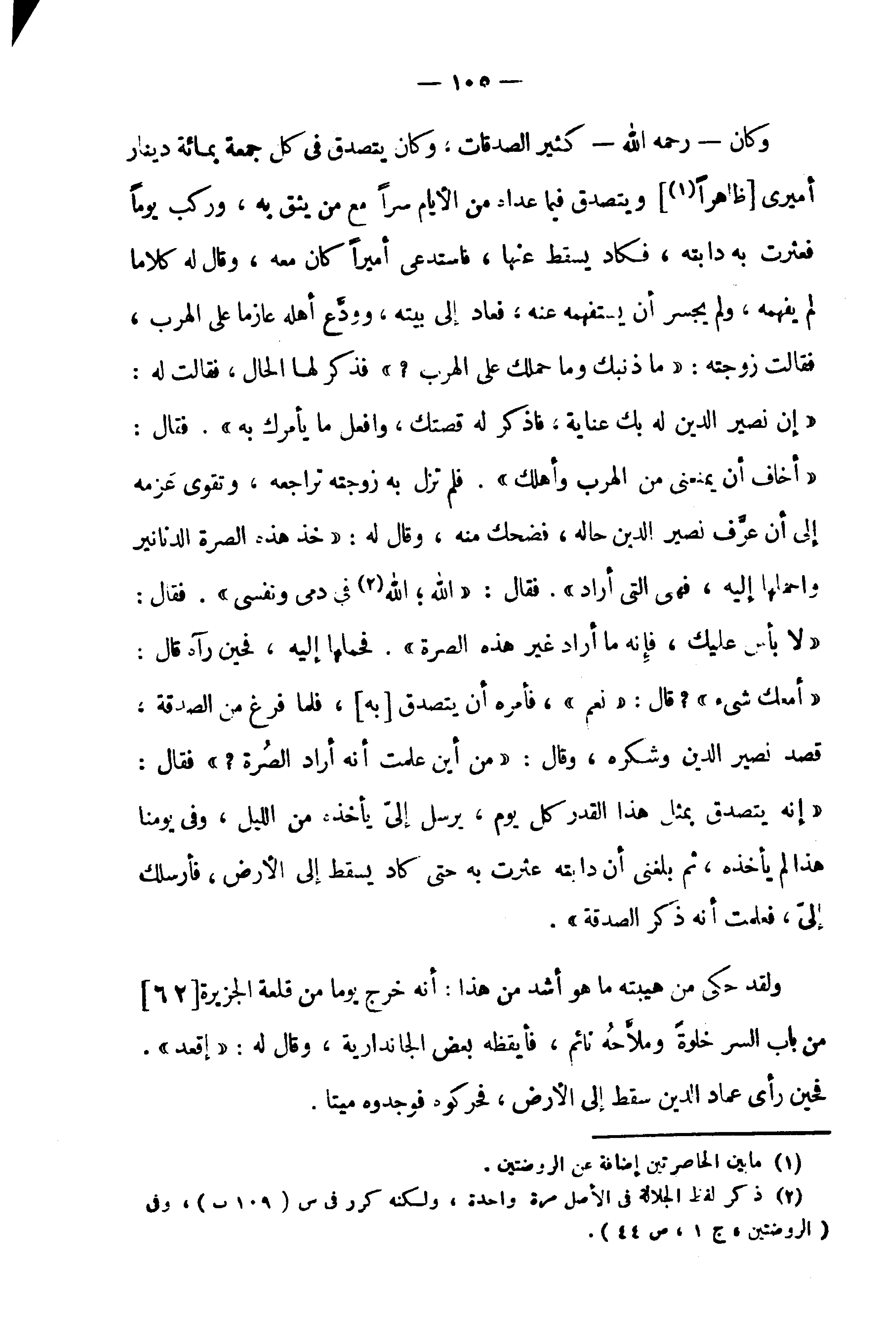 وكان - رحمه الله - كثير الصدقات، وكان يتصدق في كل جمعة بمائة دينار أميرى [ظاهرا (¬1)] ويتصدق فيما عداه من الأيام سرا مع من يثق به، وركب يوما فعثرت به دابته، فكاد يسقط عنها، فاستدعى أميرا كان معه، وقال له كلاما لم يفهمه، ولم يجسر أن يستفهمه عنه، فعاد إلى بيته، وودّع أهله عازما على الهرب، فقالت زوجته: «ما ذنبك وما حملك على الهرب؟» فذكر لها الحال، فقالت له: «إن نصير الدين له بك عناية، فاذكر له قصتك، وافعل ما يأمرك به». فقال: «أخاف أن يمنعنى من الهرب وأهلك». فلم تزل به زوجته تراجعه، وتقوى عزمه إلى أن عرّف نصير الدين حاله، فضحك منه، وقال له: «خذ هذه الصرة الدنانير واحملها إليه، فهى التي أراد». فقال: «الله؛ الله (¬2) في دمى ونفسى». فقال: «لا بأس عليك، فإنه ما أراد غير هذه الصرة». فحملها إليه، فحين رآه قال: «أمعك شىء»؟ قال: «نعم»، فأمره أن يتصدق [به]، فلما فرغ من الصدقة، قصد نصير الدين وشكره، وقال: «من أين علمت أنه أراد الصرة؟» فقال: «إنه يتصدق بمثل هذا القدر كل يوم، يرسل إلىّ يأخذه من الليل، وفى يومنا هذا لم يأخذه، ثم بلغنى أن دابته عثرت به حتى كاد يسقط إلى الأرض، فأرسلك إلىّ، فعلمت أنه ذكر الصدقة».