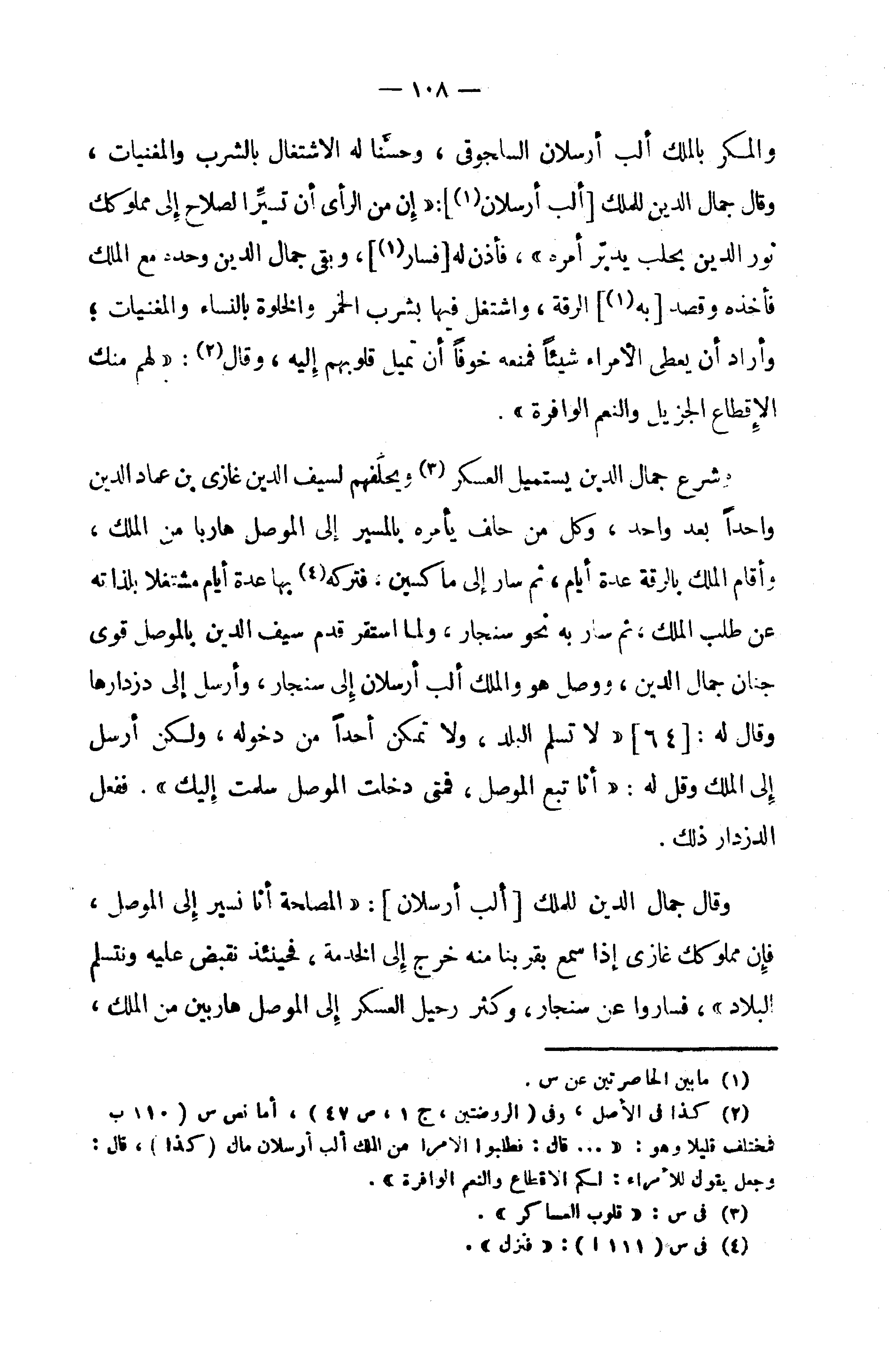 وشرع جمال الدين يستميل العسكر (¬3) ويحلفهم لسيف الدين غازى بن عماد الدين واحدا بعد واحد، وكل من حلف يأمره بالمسير إلى الموصل هاربا من الملك، وأقام الملك بالرقة عدة أيام، ثم سار إلى ماكسين، فتركه (¬4) بها عدة أيام مشتغلا بلذاته عن طلب الملك، ثم سار به نحو سنجار، ولما استقر قدم سيف الدين بالموصل قوى جنان جمال الدين، ووصل هو والملك ألب أرسلان إلى سنجار، وأرسل إلى دزدارها وقال له: [64] «لا تسلم البلد، ولا تمكن أحدا من دخوله، ولكن أرسل إلى الملك وقل له: «أنا تبع الموصل، فمتى دخلت الموصل سلمت إليك». ففعل الدزدار ذلك.