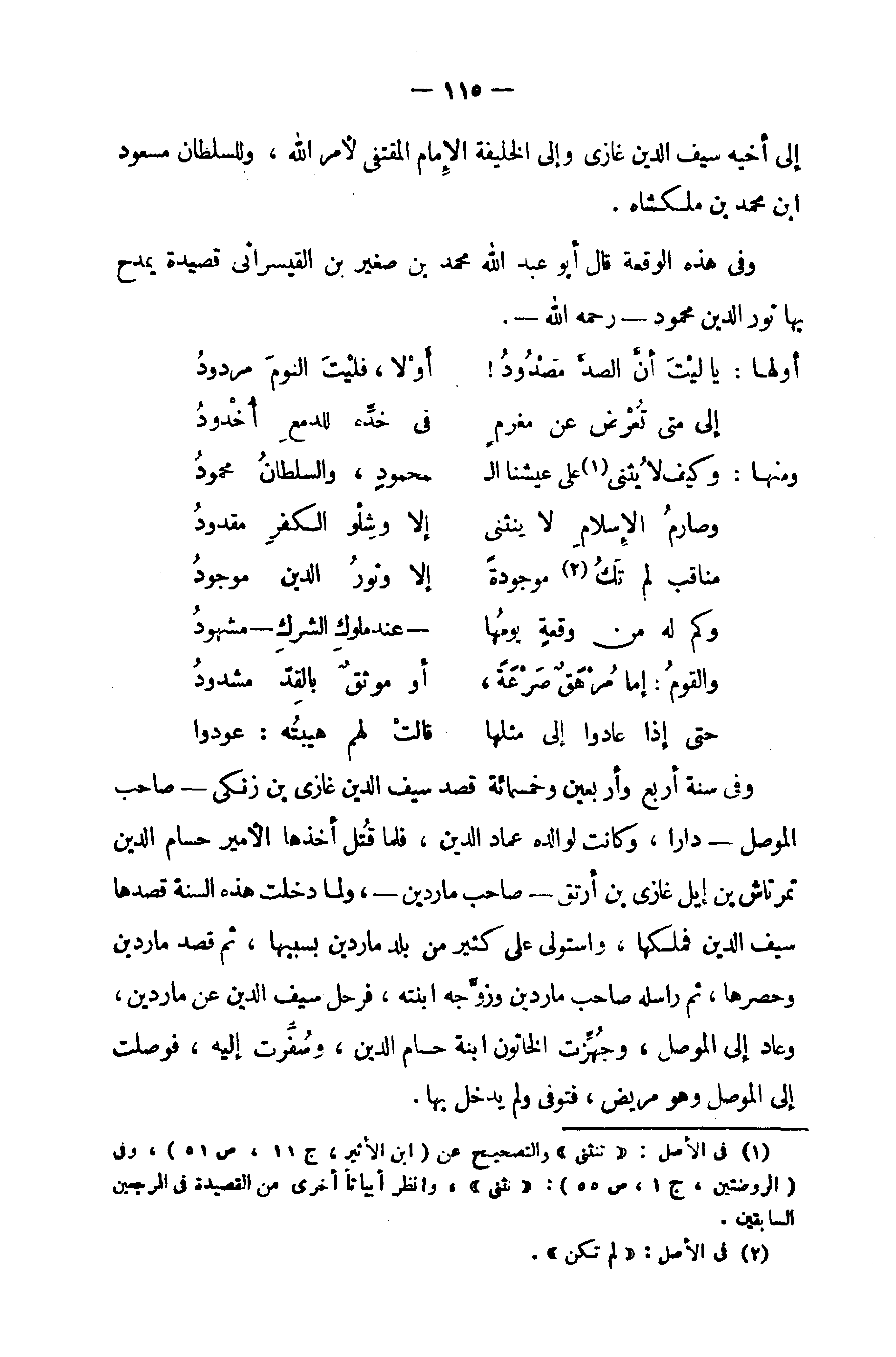 وفى هذه الوقعة قال أبو عبد الله محمد بن صغير بن القيسرانى قصيدة يمدح بها نور الدين محمود - رحمه الله -.