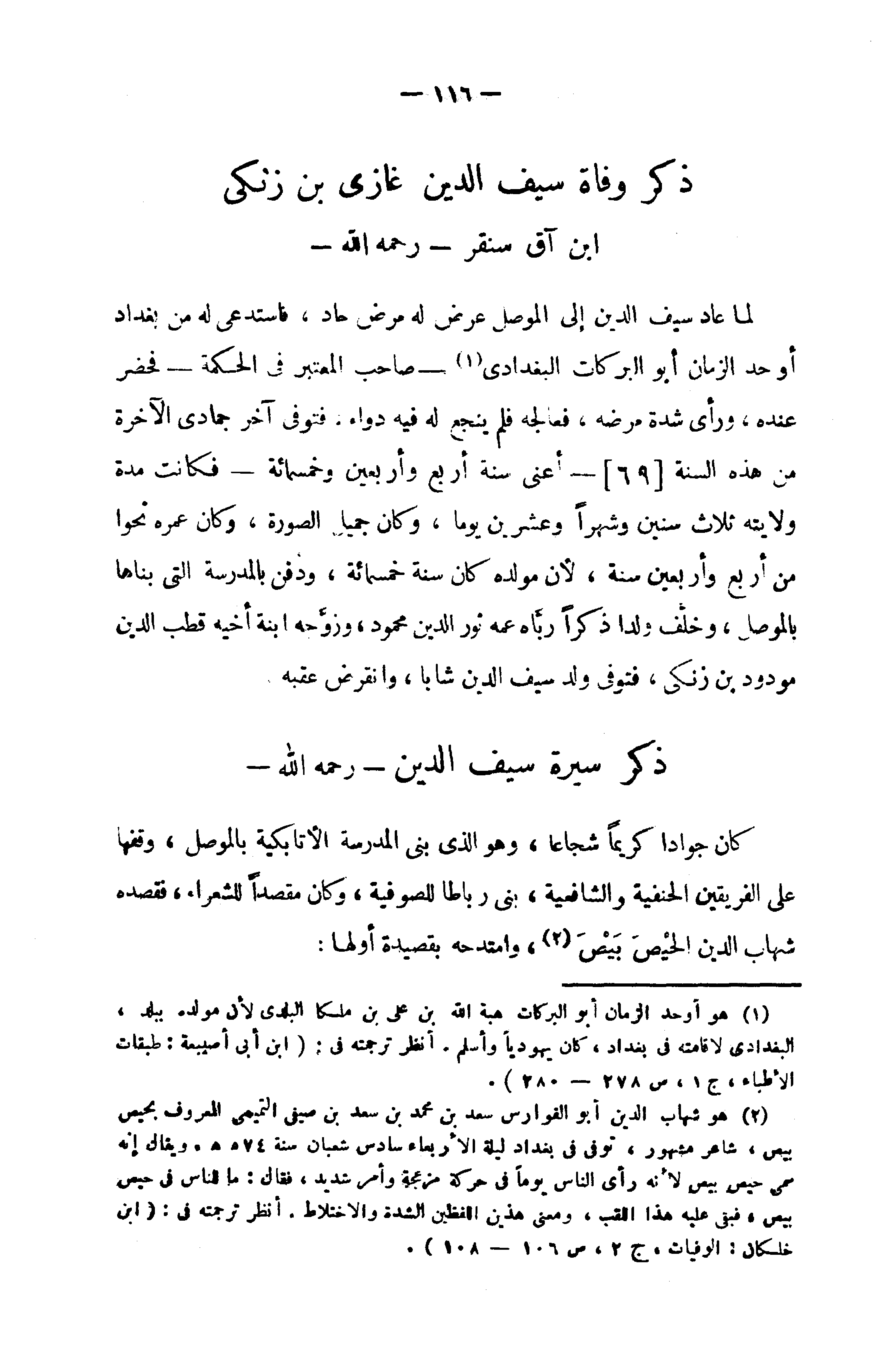 لما عاد سيف الدين إلى الموصل عرض له مرض حاد، فاستدعى له من بغداد أوحد الزمان أبو البركات البغدادى (¬1) - صاحب المعتبر في الحكمة - فحضر عنده، ورأى شدة مرضه، فعالجه فلم ينجع له فيه دواء، فتوفى آخر جمادى الآخرة من هذه السنة [69]- أعنى سنة أربع وأربعين وخمسمائة - فكانت مدة ولايته ثلاث سنين وشهرا وعشرين يوما، وكان جميل الصورة، وكان عمره نحوا من أربع وأربعين سنة، لأن مولده كان سنة خمسمائة، ودفن بالمدرسة التي بناها بالموصل، وخلّف ولدا ذكرا ربّاه عمه نور الدين محمود، وزوّجه ابنة أخيه قطب الدين مودود بن زنكى، فتوفى ولد سيف الدين شابا، وانقرض عقبه.
