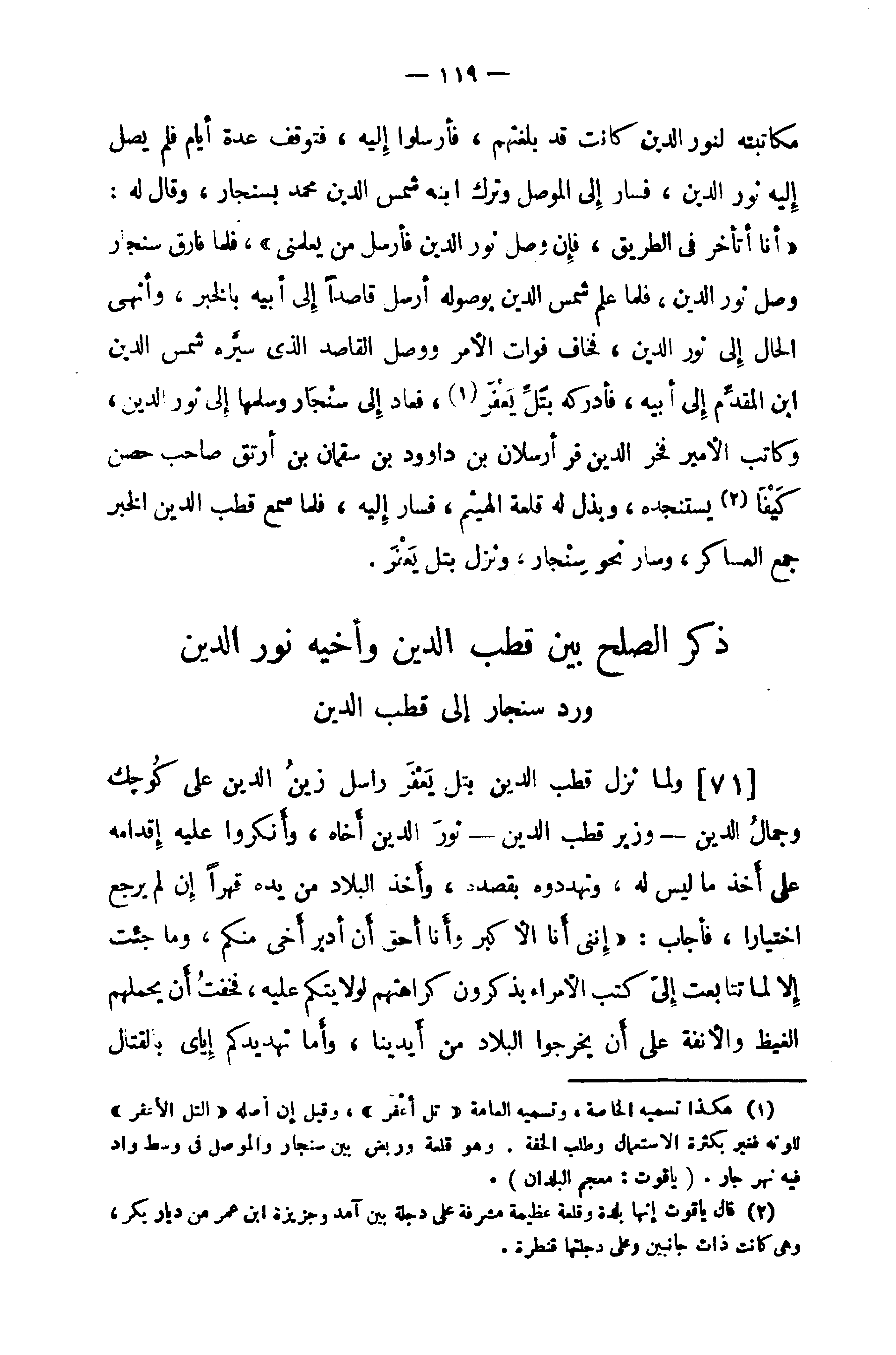 [71] ولما نزل قطب الدين بتل يعفر راسل زين الدين على كوجك وجمال الدين - وزير قطب الدين - نور الدين أخاه، وأنكروا عليه إقدامه على أخذ ما ليس له، وتهددوه بقصده، وأخذ البلاد من يده قهرا إن لم يرجع اختيارا، فأجاب: «إننى أنا الأكبر وأنا أحق أن أدبر أخى منكم، وما جئت إلا لما تتابعت إلىّ كتب الأمراء يذكرون كراهتهم لولايتكم عليه، فخفت أن يحملهم الغيظ والأنفة على أن يخرجوا البلاد من أيدينا، وأما تهديدكم إياى بالقتال