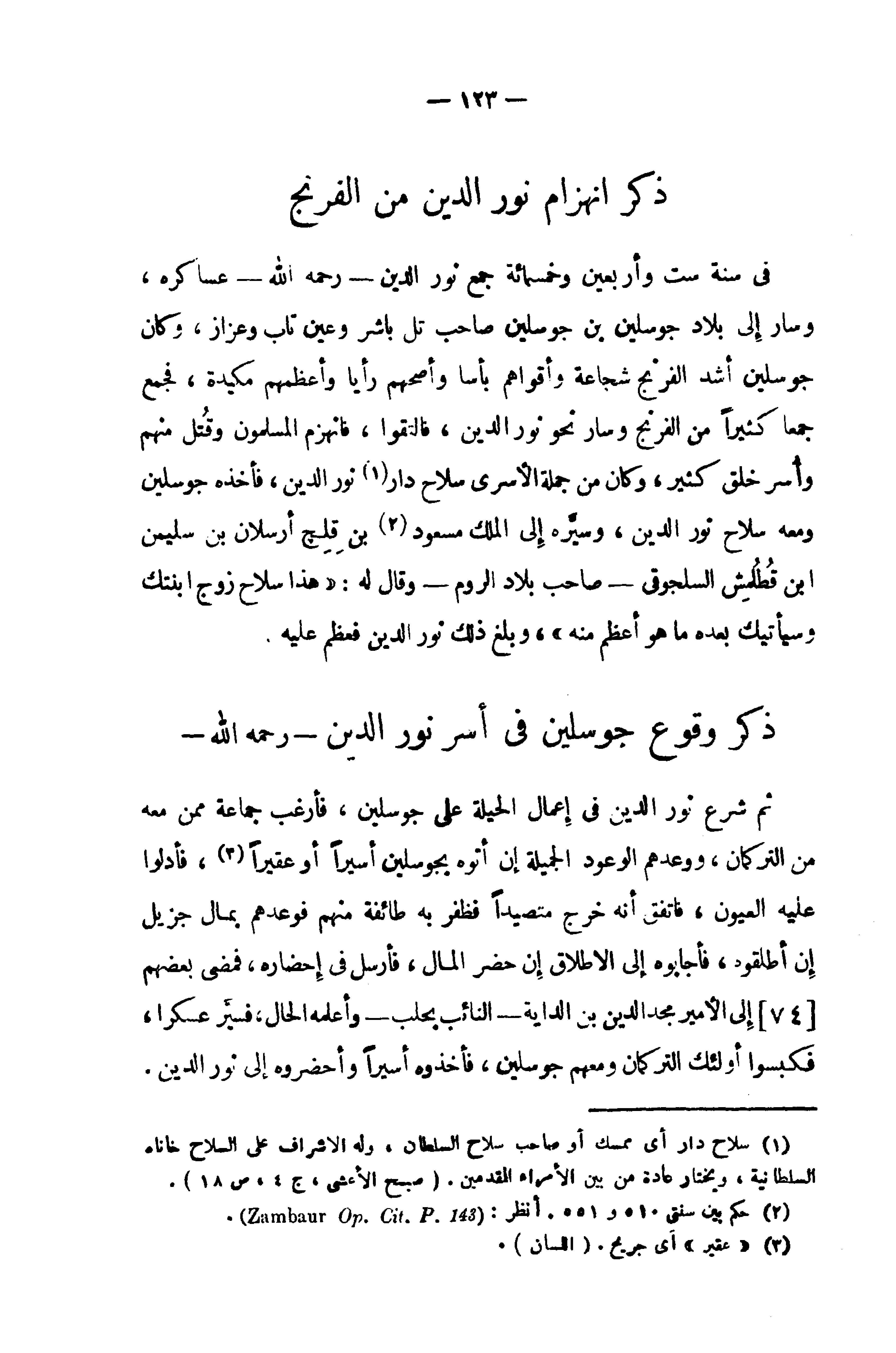 في سنة ست وأربعين وخمسمائة جمع نور الدين - رحمه الله - عساكره، وسار إلى بلاد جوسلين بن جوسلين صاحب تل باشر وعين تاب وعزاز، وكان جوسلين أشد الفرنج شجاعة وأقواهم بأسا وأصحهم رأيا وأعظمهم مكيدة، فجمع جمعا كثيرا من الفرنج وسار نحو نور الدين، فالتقوا، فانهزم المسلمون وقتل منهم وأسر خلق كثير، وكان من جملة الأسرى سلاح دار (¬1) نور الدين، فأخذه جوسلين ومعه سلاح نور الدين، وسيّره إلى الملك مسعود (¬2) بن قلج أرسلان بن سليمن ابن قطلمش السلجوقى - صاحب بلاد الروم - وقال له: «هذا سلاح زوج ابنتك وسيأتيك بعده ما هو أعظم منه»، وبلغ ذلك نور الدين فعظم عليه.