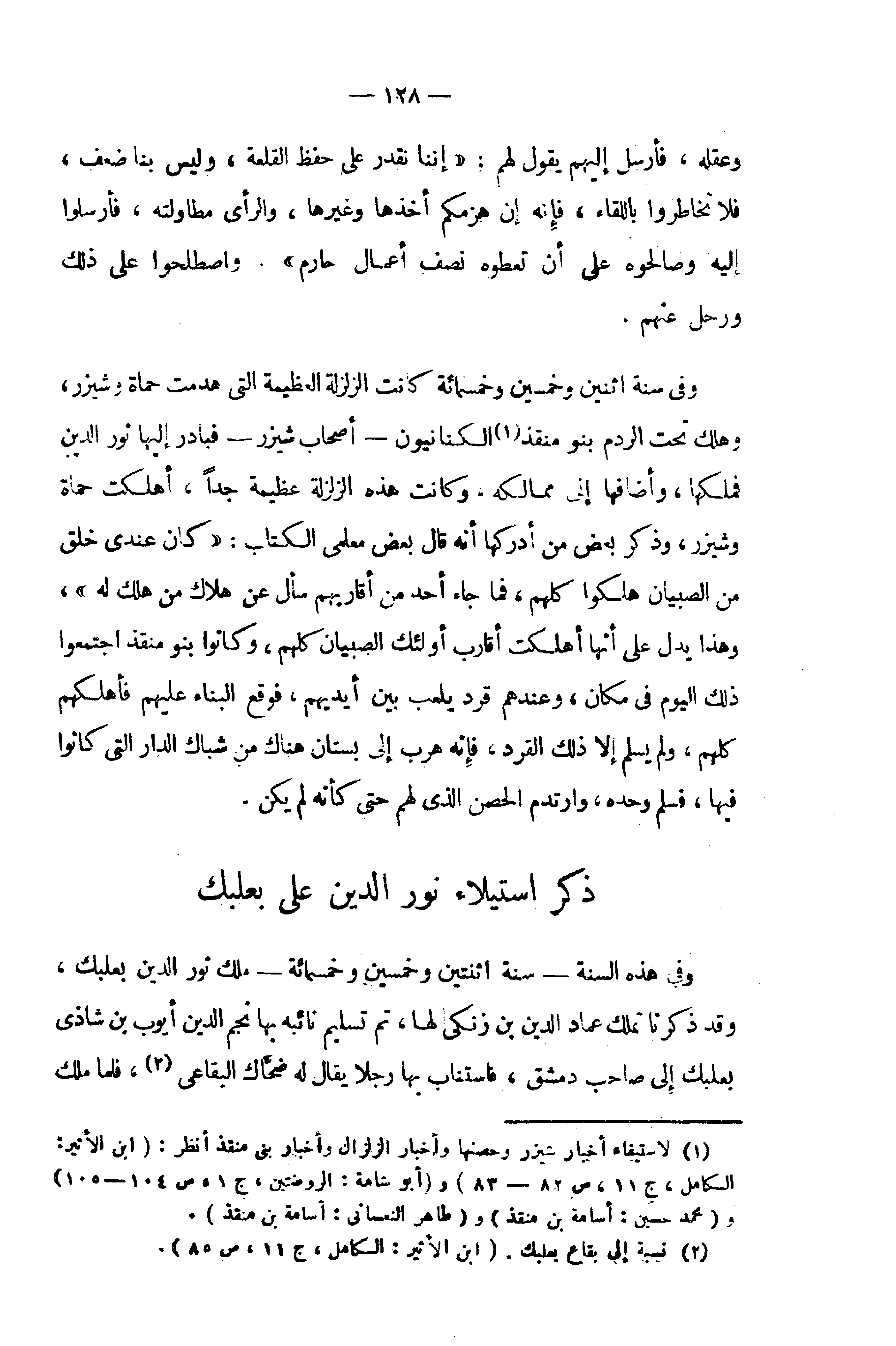 (¬1) لاستيفاء أخبار شيزر وحصنها وأخبار الزلزال وأخبار بنى منقذ أنظر: (ابن الأثير: الكامل، ج 11، ص 82 - 83) و (أبو شامة: الروضتين، ج 1، ص 104 - 105) و (محمد حسين: أسامة بن منقذ) و (طاهر النعسانى: أسامة بن منقذ).