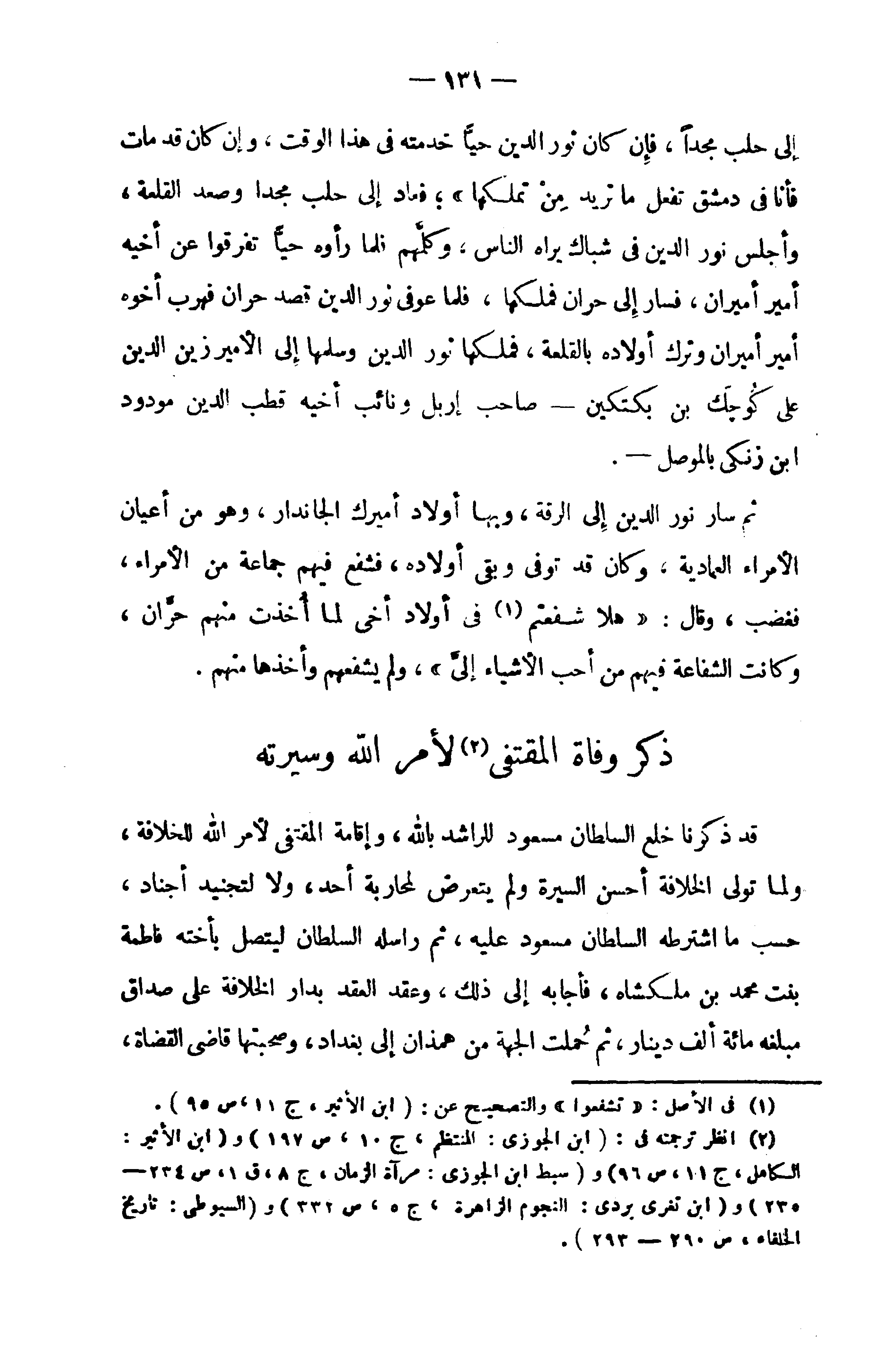 (¬2) انظر ترجمته في: (ابن الجوزى: المنتظم، ج 10، ص 197) و (ابن الأثير: الكامل، ج 11، ص 96) و (سبط ابن الجوزى: مرآة الزمان، ج 8، ق 1، ص 234 - 235) و (ابن تغرى بردى: النجوم الزاهرة، ج 5، ص 332) و (السيوطى: تاريخ الخلفاء، ص 290 - 293).