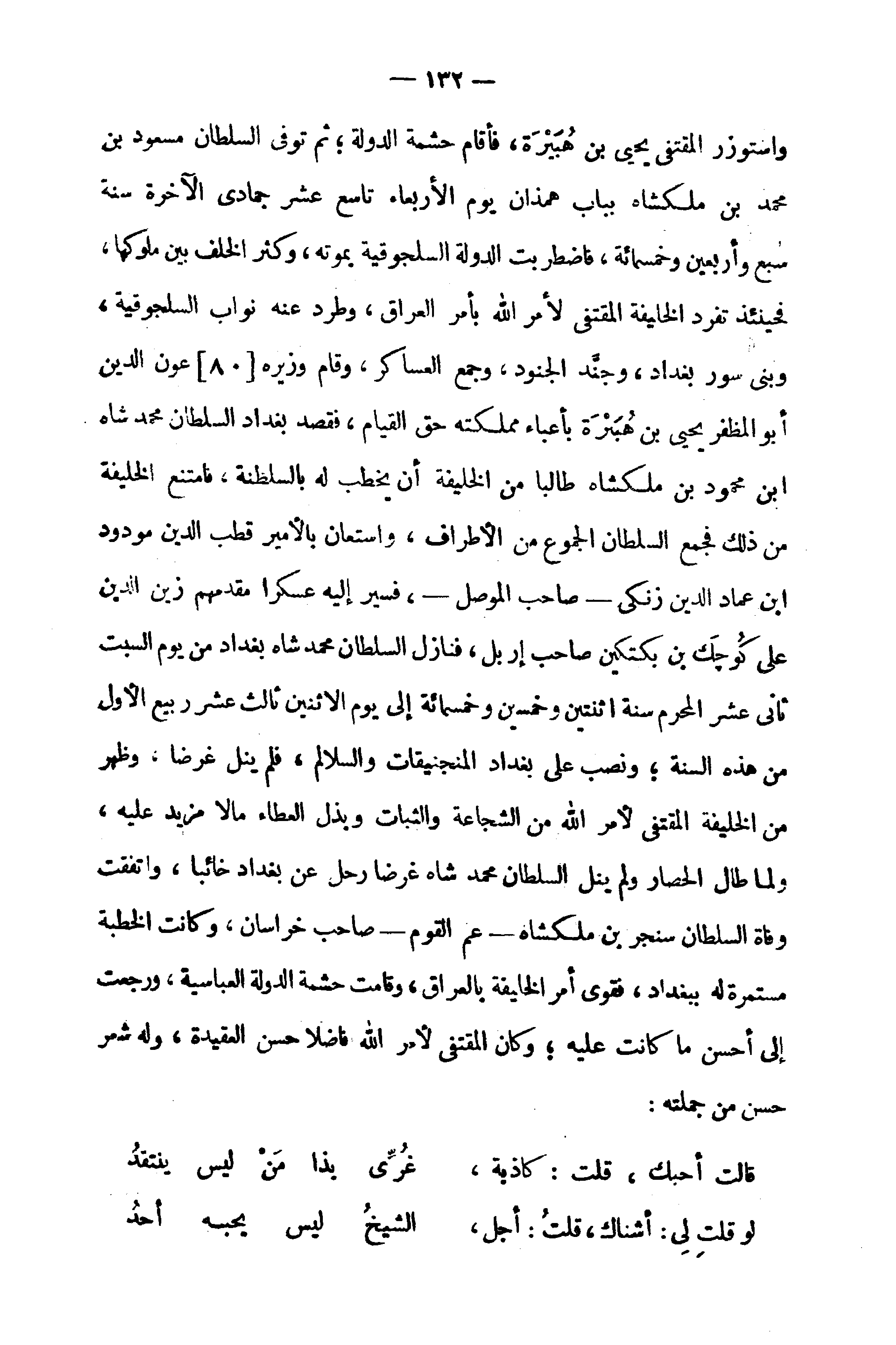 واستوزر المقتفى يحيى بن هبيرة، فأقام حشمة الدولة؛ ثم توفى السلطان مسعود بن محمد بن ملكشاه بباب همذان يوم الأربعاء تاسع عشر جمادى الآخرة سنة سبع وأربعين وخمسمائة، فاضطربت الدولة السلجوقية بموته، وكثر الخلف بين ملوكها، فحينئذ تفرد الخليفة المقتفى لأمر الله بأمر العراق، وطرد عنه نواب السلجوقية، وبنى سور بغداد، وجنّد الجنود، وجمع العساكر، وقام وزيره [80] عون الدين أبو المظفر يحيى بن هبيرة بأعباء مملكته حق القيام، فقصد بغداد السلطان محمد شاه ابن محمود بن ملكشاه طالبا من الخليفة أن يخطب له بالسلطنة، فامتنع الخليفة من ذلك فجمع السلطان الجموع من الأطراف، واستعان بالأمير قطب الدين مودود ابن عماد الدين زنكى - صاحب الموصل -، فسير إليه عسكرا مقدمهم زين الدين على كوجك بن بكتكين صاحب إربل، فنازل السلطان محمد شاه بغداد من يوم السبت ثانى عشر المحرم سنة اثنتين وخمسين وخمسمائة إلى يوم الاثنين ثالث عشر ربيع الأول من هذه السنة؛ ونصب على بغداد المنجنيقات والسلالم، فلم ينل غرضا، وظهر من الخليفة المقتفى لأمر الله من الشجاعة والثبات وبذل العطاء مالا مزيد عليه، ولما طال الحصار ولم ينل السلطان محمد شاه غرضا رحل عن بغداد خائبا، واتفقت وفاة السلطان سنجر بن ملكشاه - عم القوم - صاحب خراسان، وكانت الخطبة مستمرة له ببغداد، فقوى أمر الخليفة بالعراق، وقامت حشمة الدولة العباسية، ورجعت إلى أحسن ما كانت عليه؛ وكان المقتفى لأمر الله فاضلا حسن العقيدة، وله شعر حسن من جملته: