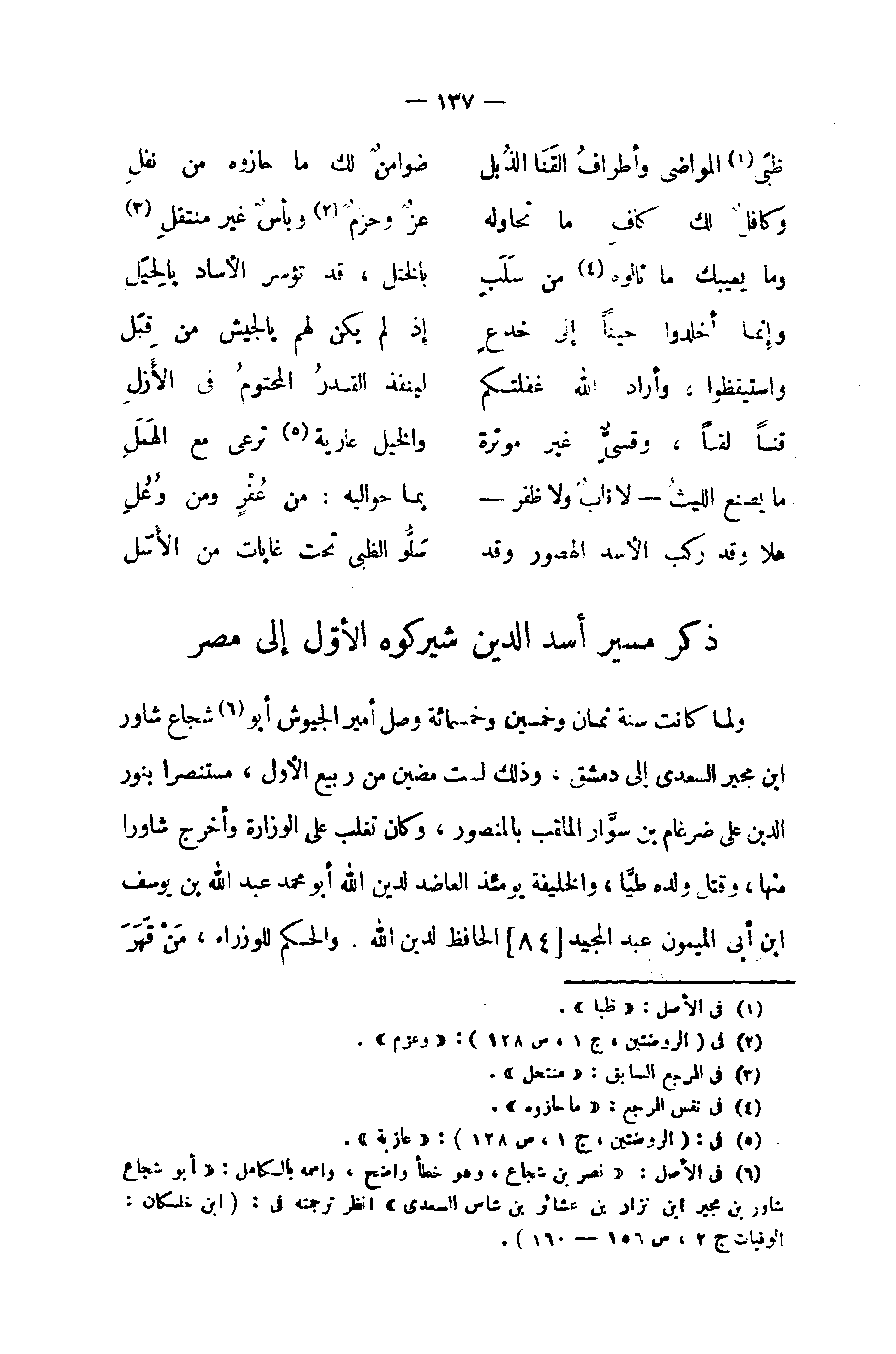 (¬6) في الأصل: «نصر بن شجاع، وهو خطأ واضح، واسمه بالكامل: «أبو شجاع شاور بن مجير ابن نزار بن عشائر بن شاس السعدى» انظر ترجمته في: (ابن خلكان: الوفيات ج 2، ص 156 - 160).