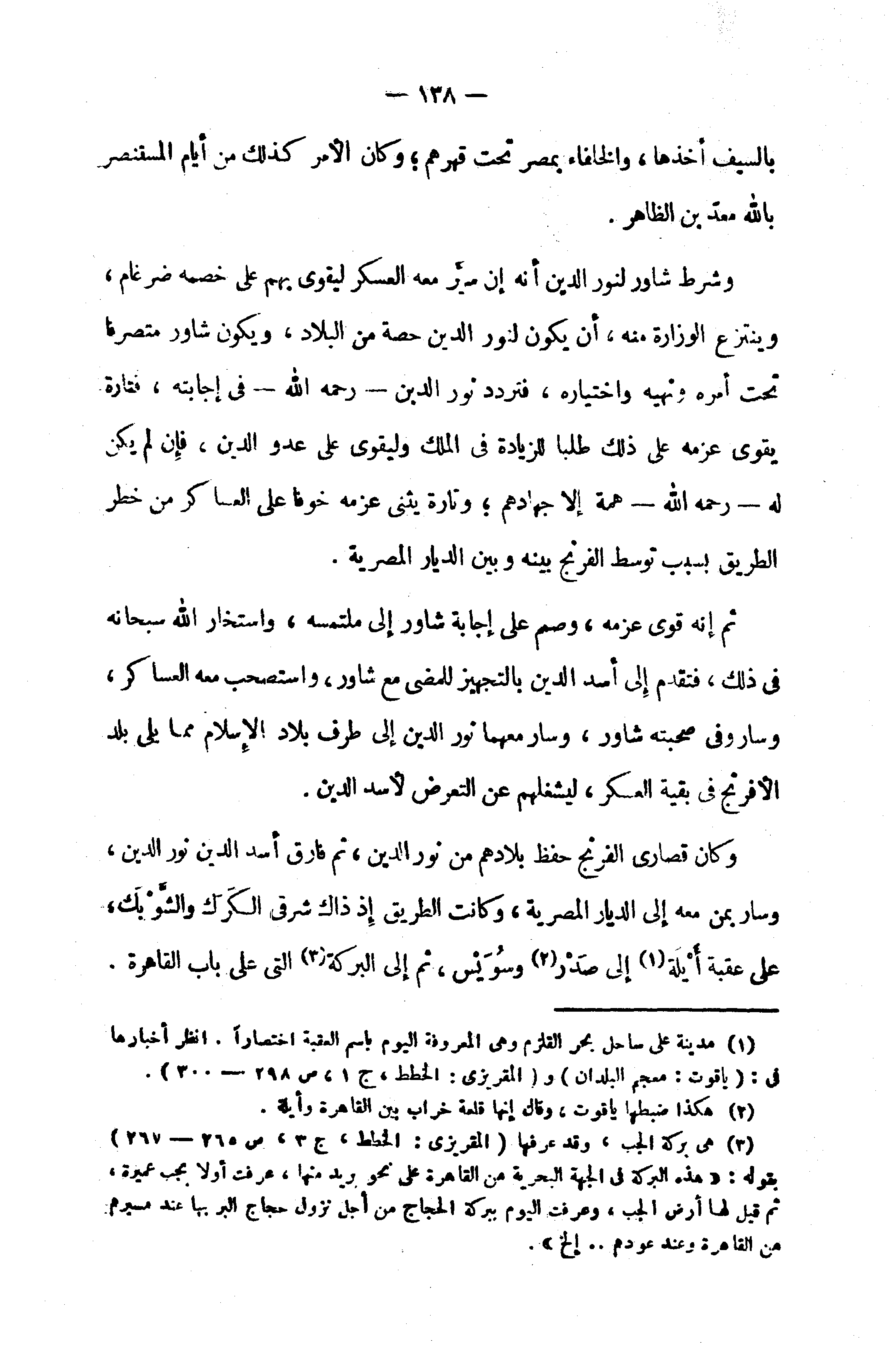 وكان قصارى الفرنج حفظ بلادهم من نور الدين، ثم فارق أسد الدين نور الدين، وسار بمن معه إلى الديار المصرية، وكانت الطريق إذ ذاك شرقى الكرك والشّوبك، على عقبة أيلة (¬1) إلى صدر (¬2) وسويس، ثم إلى البركة (¬3) التي على باب القاهرة.