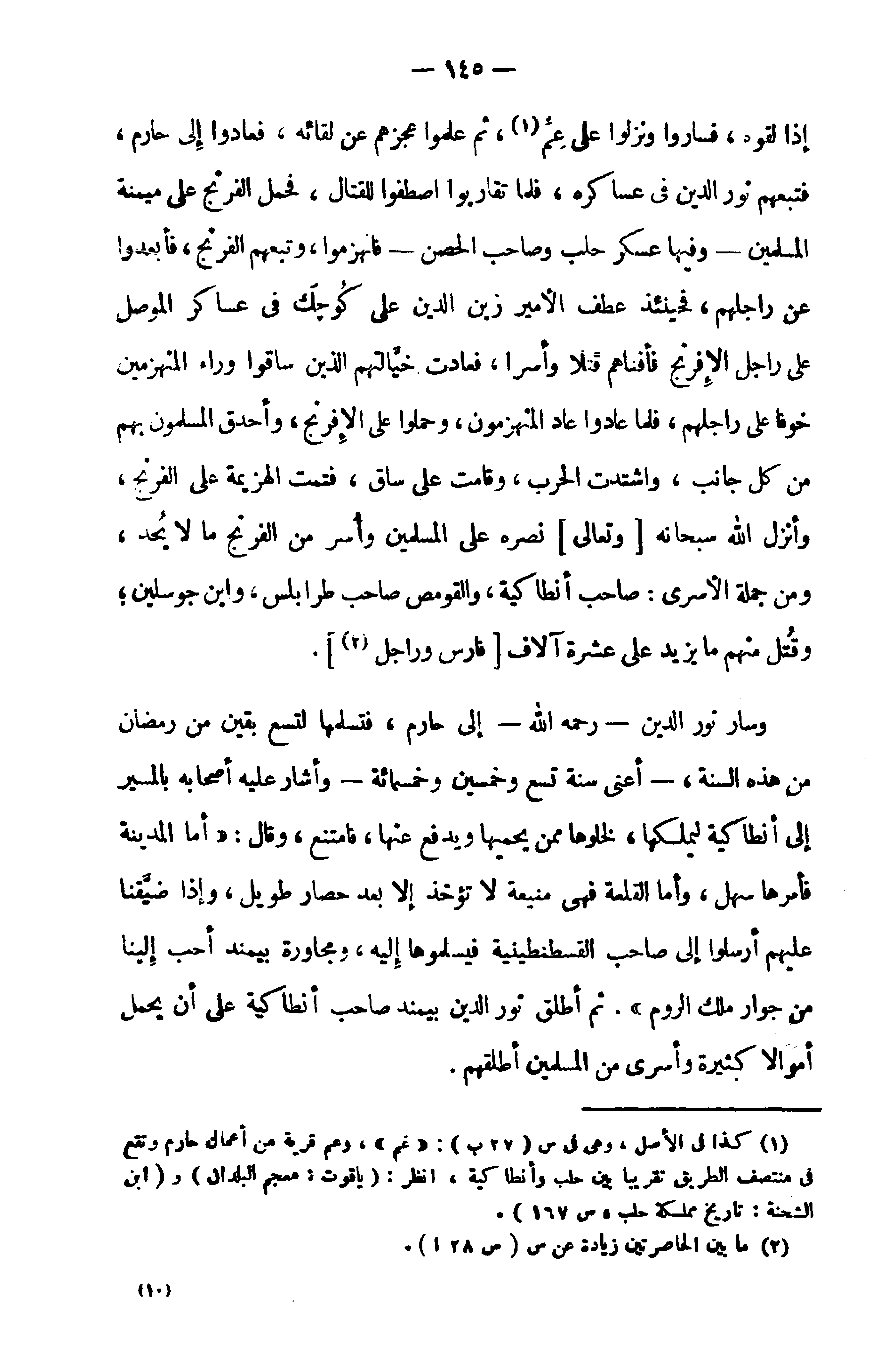 إذا لقوه، فساروا ونزلوا على عمّ (¬1)، ثم علموا عجزهم عن لقائه، فعادوا إلى حارم، فتبعهم نور الدين في عساكره، فلما تقاربوا اصطفوا للقتال، فحمل الفرنج على ميمنة المسلمين - وفيها عسكر حلب وصاحب الحصن - فانهزموا، وتبعهم الفرنج، فأبعدوا عن راجلهم، فحينئذ عطف الأمير زين الدين على كوجك في عساكر الموصل على راجل الإفرنج فأفناهم قتلا وأسرا، فعادت خيّالتهم الذين ساقوا وراء المنهزمين خوفا على راجلهم، فلما عادوا عاد المنهزمون، وحملوا على الإفرنج، وأحدق المسلمون بهم من كل جانب، واشتدت الحرب، وقامت على ساق، فتمت الهزيمة على الفرنج، وأنزل الله سبحانه [وتعالى] نصره على المسلمين وأسر من الفرنج ما لا يحد، ومن جملة الأسرى: صاحب أنطاكية، والقومص صاحب طرابلس، وابن جوسلين؛ وقتل منهم ما يزيد على عشرة آلاف [فارس وراجل (¬2)].