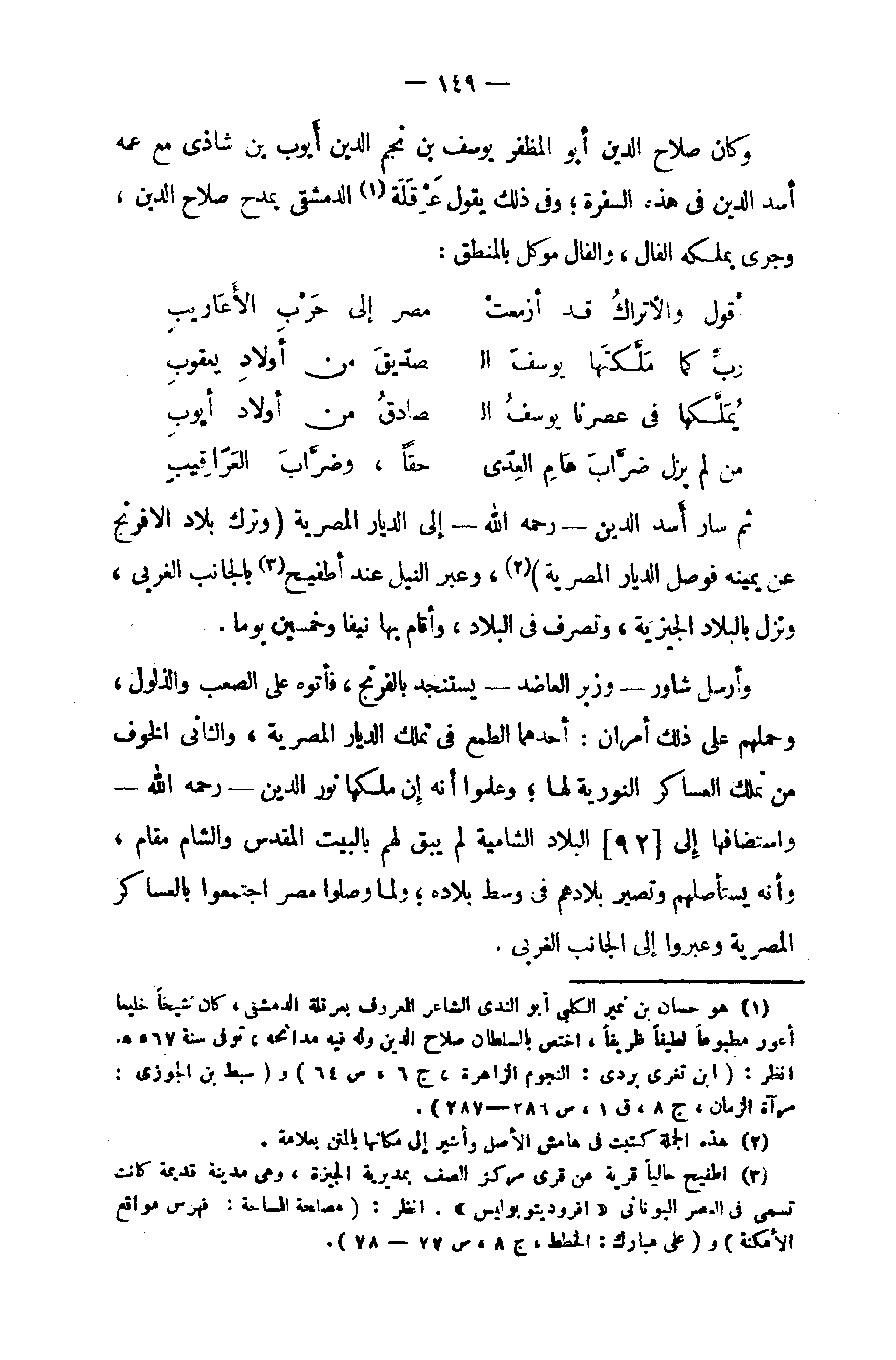 وكان صلاح الدين أبو المظفر يوسف بن نجم الدين أيوب بن شاذى مع عمه أسد الدين في هذه السفرة؛ وفى ذلك يقول عرقلة (¬1) الدمشقى يمدح صلاح الدين، وجرى بملكه الفال، والفال موكل بالمنطق: