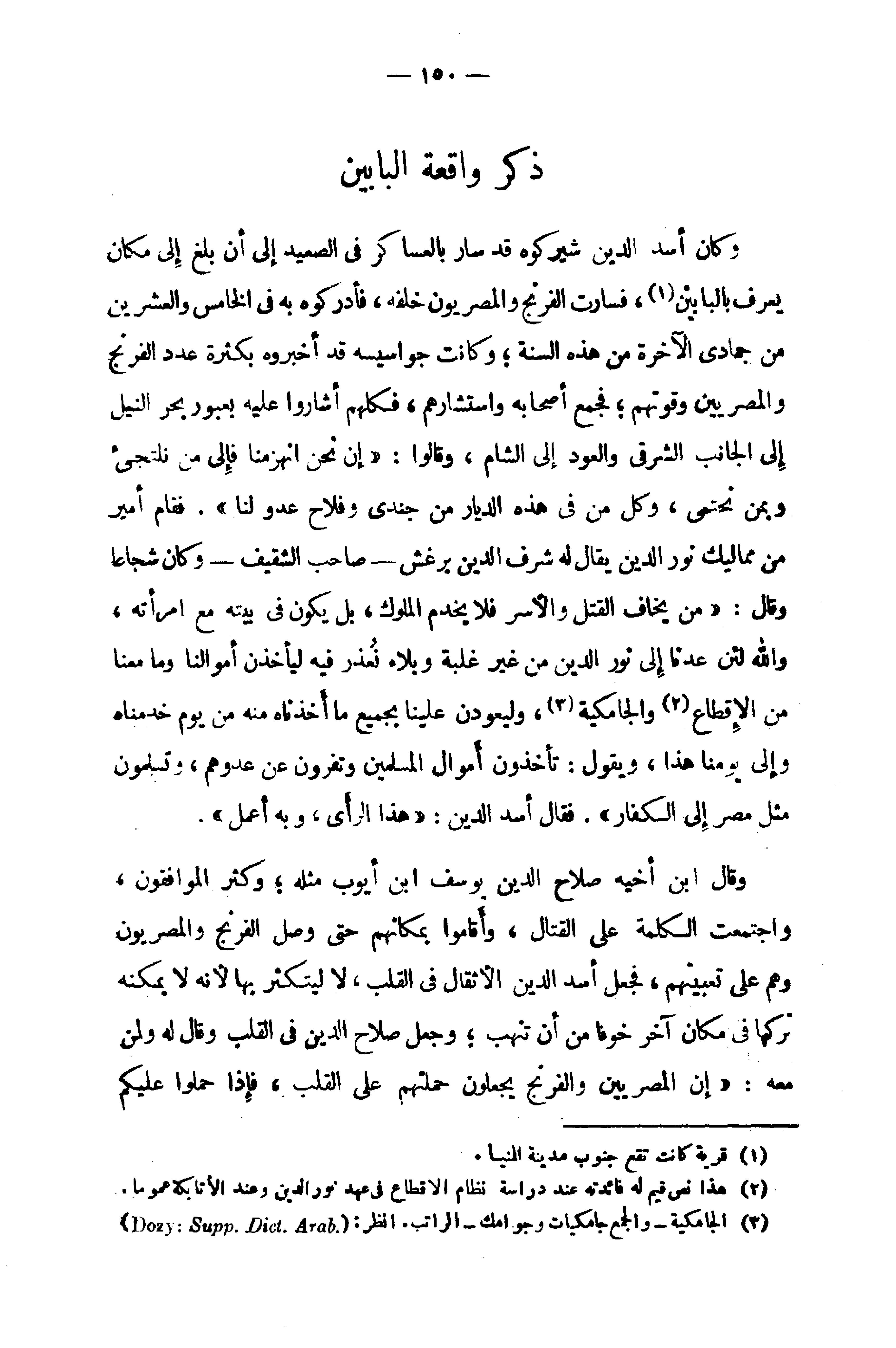 وكان أسد الدين شيركوه قد سار بالعساكر في الصعيد إلى أن بلغ إلى مكان يعرف بالبابين (¬1)، فسارت الفرنج والمصريون خلفه، فأدركوه به في الخامس والعشرين من جمادى الآخرة من هذه السنة؛ وكانت جواسيسه قد أخبروه بكثرة عدد الفرنج والمصريين وقوتهم؛ فجمع أصحابه واستشارهم، فكلهم أشاروا عليه بعبور بحر النيل إلى الجانب الشرقى والعود إلى الشام، وقالوا: «إن نحن انهزمنا فإلى من نلتجئ وبمن نحتمى، وكل من في هذه الديار من جندى وفلاح عدو لنا». فقام أمير من مماليك نور الدين يقال له شرف الدين برغش - صاحب الشقيف - وكان شجاعا وقال: «من يخاف القتل والأسر فلا يخدم الملوك، بل يكون في بيته مع امرأته، والله لئن عدنا إلى نور الدين من غير غلبة وبلاء نعذر فيه ليأخذن أموالنا وما معنا من الإقطاع (¬2) والجامكية (¬3)، وليعودن علينا بجميع ما أخذناه منه من يوم خدمناه وإلى يومنا هذا، ويقول: تأخذون أموال المسلمين وتفرون عن عدوهم، وتسلمون مثل مصر إلى الكفار». فقال أسد الدين: «هذا الرأى، وبه أعمل».