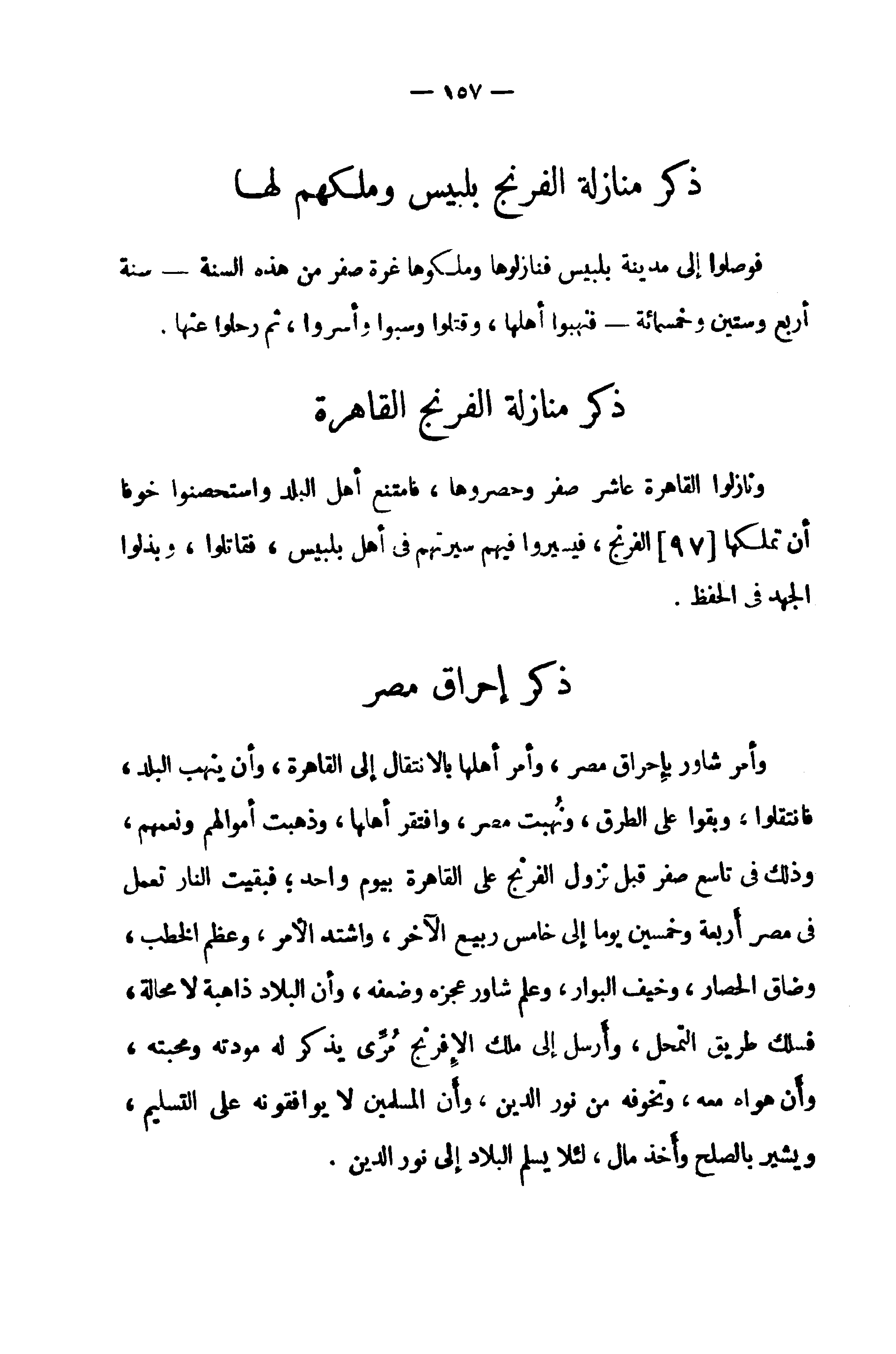 ونازلوا القاهرة عاشر صفر وحصروها، فامتنع أهل البلد واستحصنوا خوفا أن تملكها [97] الفرنج، فيسيروا فيهم سيرتهم في أهل بلبيس، فقاتلوا، وبذلوا الجهد في الحفظ.
