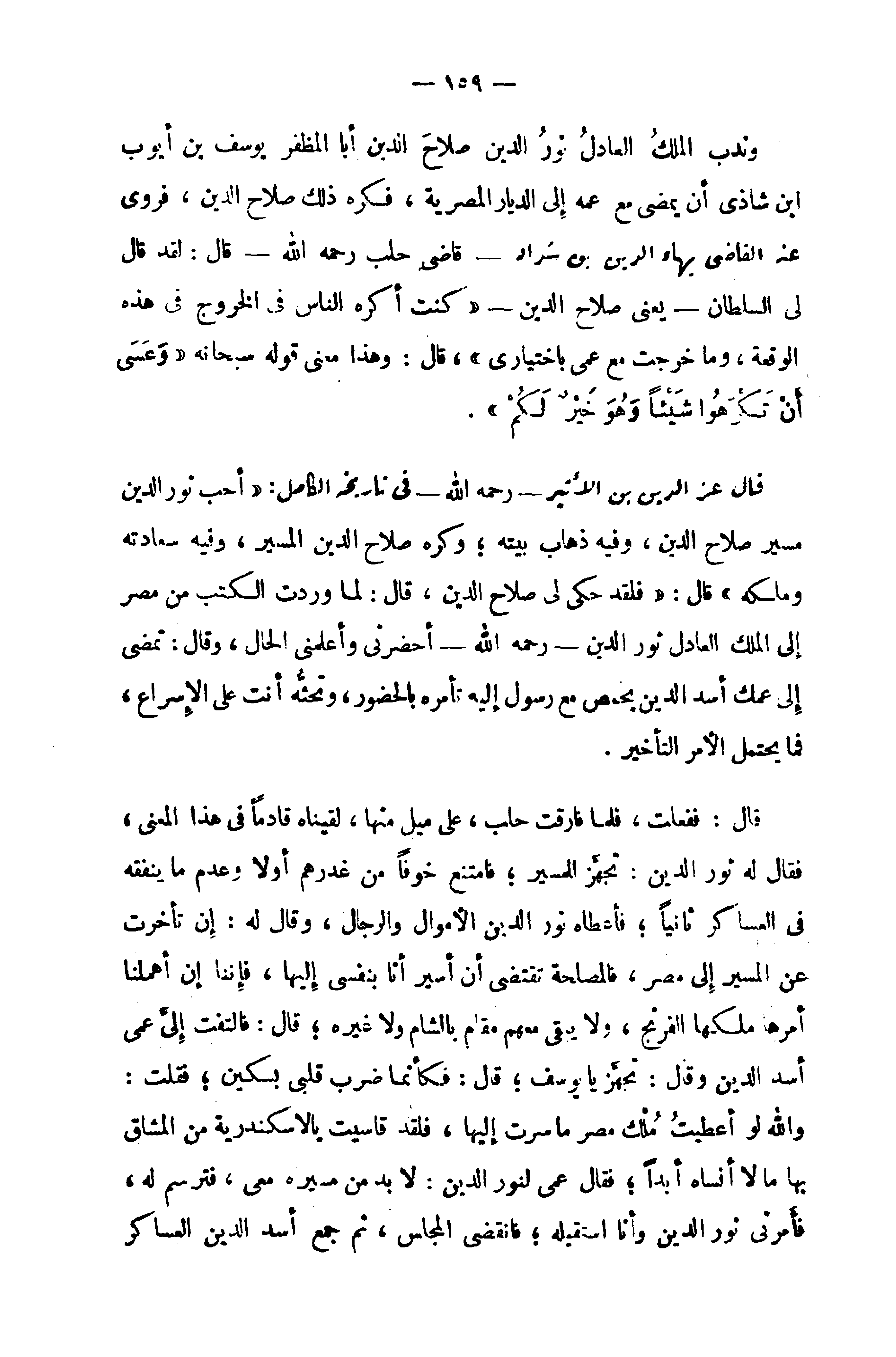 قال: ففعلت، فلما فارقت حلب، على ميل منها، لقيناه قادما في هذا المعنى، فقال له نور الدين: تجهّز للمسير؛ فامتنع خوفا من غدرهم أولا وعدم ما ينفقه في العساكر ثانيا؛ فأعطاه نور الدين الأموال والرجال، وقال له: إن تأخرت عن المسير إلى مصر، فالمصلحة تقتضى أن أسير أنا بنفسى إليها، فإننا إن أهملنا أمرها ملكها الفرنج، ولا يبقى معهم مقام بالشام ولا غيره؛ قال: فالتفت إلىّ عمى أسد الدين وقال: تجهّز يا يوسف؛ قال: فكأنما ضرب قلبى بسكين؛ فقلت: والله لو أعطيت ملك مصر ما سرت إليها، فلقد قاسيت بالاسكندرية من المشاق بها ما لا أنساه أبدا؛ فقال عمى لنور الدين: لا بد من مسيره معى، فترسم له، فأمرنى نور الدين وأنا استقيله؛ فانقضى المجلس، ثم جمع أسد الدين العساكر