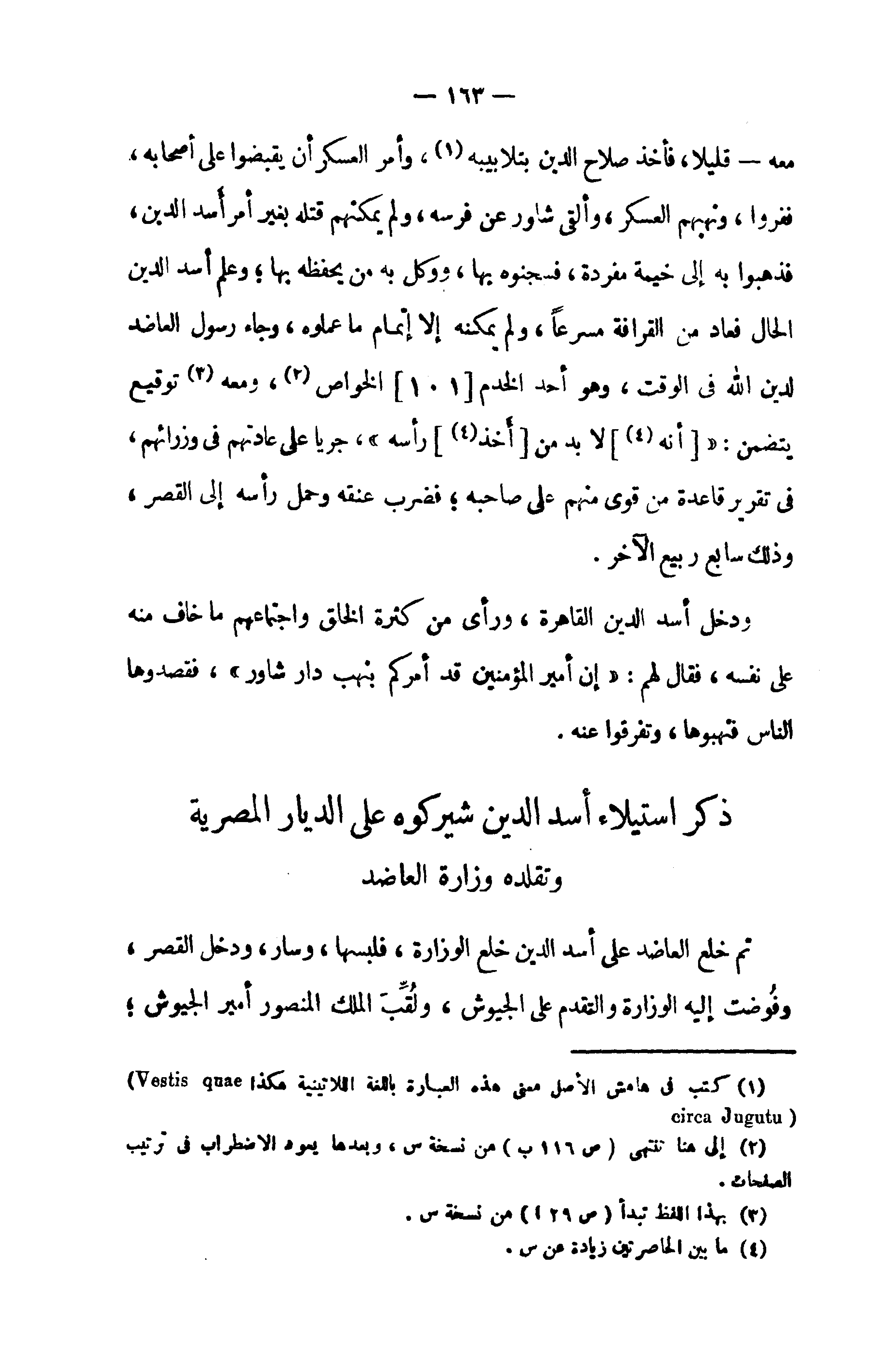 معه - قليلا، فأخذ صلاح الدين بتلابيبه (¬1)، وأمر العسكر أن يقبضوا على أصحابه، ففروا، ونهبهم العسكر، وألقى شاور عن فرسه، ولم يمكنهم قتله بغير أمر أسد الدين، فذهبوا به إلى خيمة مفردة، فسجنوه بها، ووكل به من يحفظه بها؛ وعلم أسد الدين الحال فعاد من القرافة مسرعا، ولم يمكنه إلا إتمام ما عملوه، وجاء رسول العاضد لدين الله في الوقت، وهو أحد الخدم [101] الخواص (¬2)، ومعه (¬3) توقيع يتضمن: «[أنه (4)] لا بد من [أخذ (¬4)] رأسه»، جريا على عادتهم في وزرائهم، في تقرير قاعدة من قوى منهم على صاحبه؛ فضرب عنقه وحمل رأسه إلى القصر، وذلك سابع ربيع الآخر.