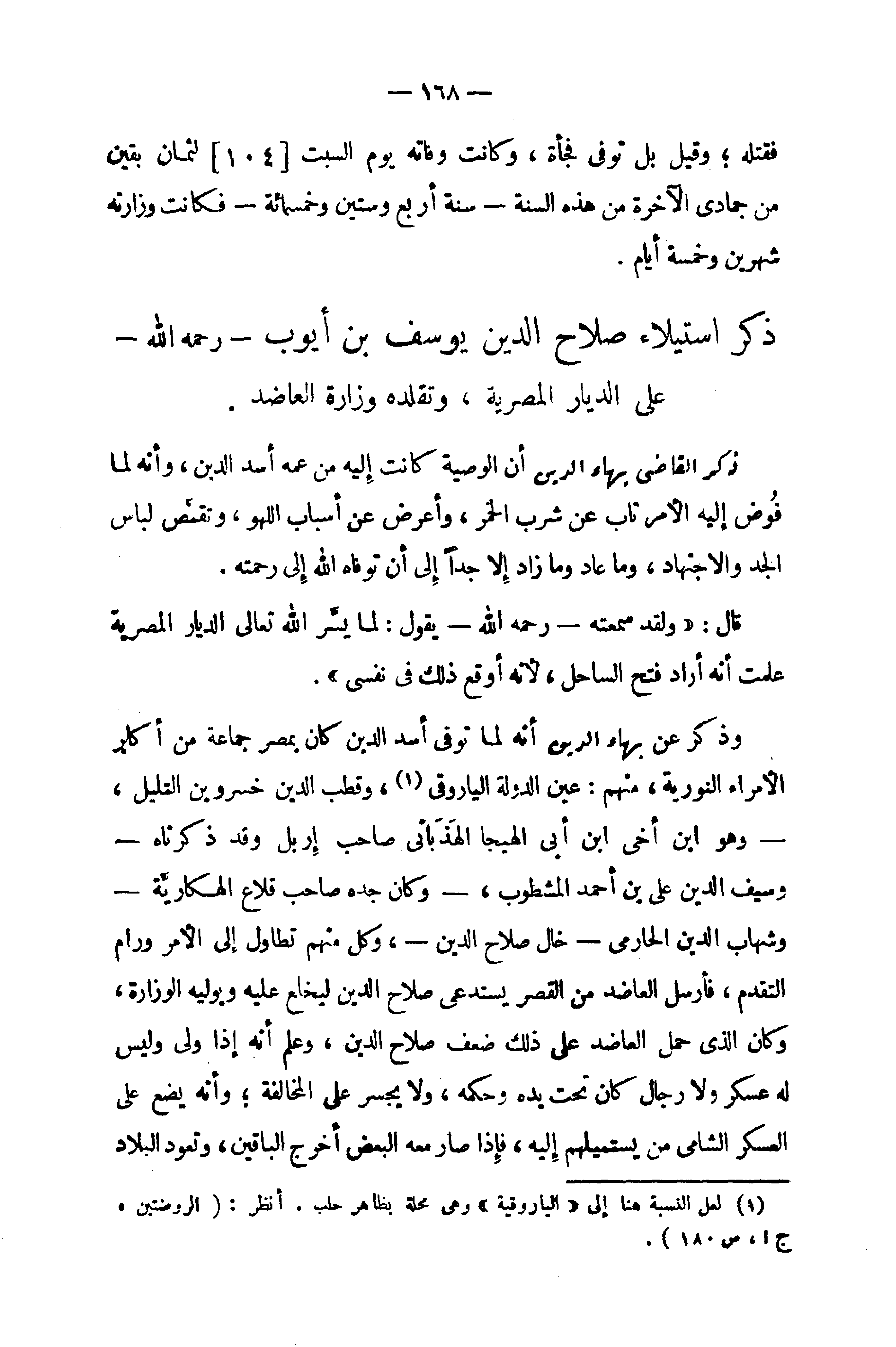 وذكر عن بهاء الدين أنه لما توفى أسد الدين كان بمصر جماعة من أكابر الأمراء النورية، منهم: عين الدولة الياروقى (¬1)، وقطب الدين خسرو بن التليل، - وهو ابن أخى ابن أبى الهيجا الهذبانى صاحب إربل وقد ذكرناه - وسيف الدين على بن أحمد المشطوب، - وكان جده صاحب قلاع الهكاريّة - وشهاب الدين الحارمى - خال صلاح الدين -، وكل منهم تطاول إلى الأمر ورام التقدم، فأرسل العاضد من القصر يستدعى صلاح الدين ليخلع عليه ويوليه الوزارة، وكان الذى حمل العاضد على ذلك ضعف صلاح الدين، وعلم أنه إذا ولى وليس له عسكر ولا رجال كان تحت يده وحكمه، ولا يجسر على المخالفة؛ وأنه يضع على العسكر الشامى من يستميلهم إليه، فإذا صار معه البعض أخرج الباقين، وتعود البلاد
