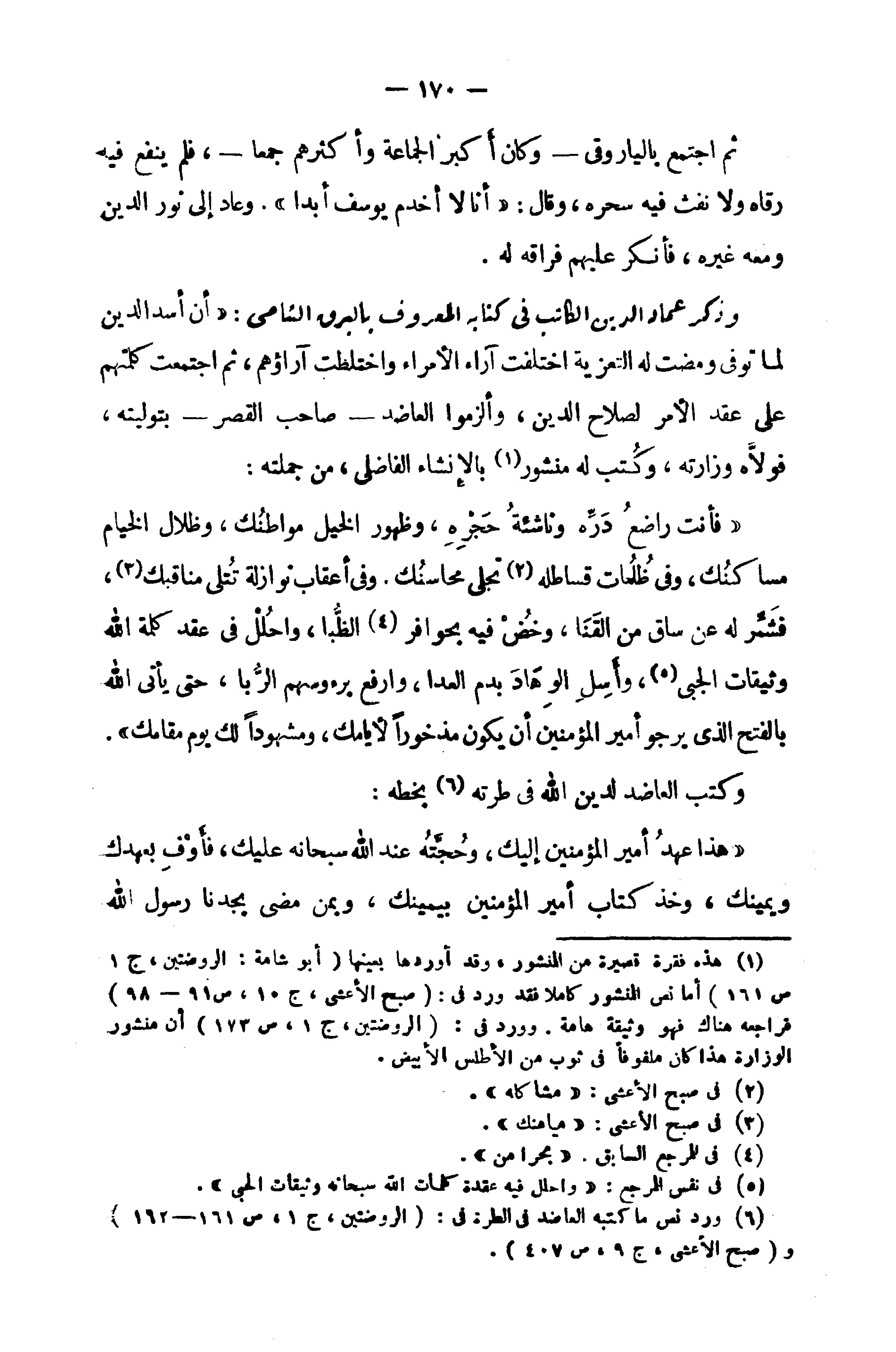 (¬1) هذه فقرة قصيرة من المنشور، وقد أوردها بعينها (أبو شامة: الروضتين، ج 1 ص 161) أما نص المنشور كاملا فقد ورد في: (صبح الأعشى، ج 10، ص 91 - 98) فراجعه هناك فهو وثيقة هامة. وورد في: (الروضتين، ج 1، ص 173) أن منشور الوزارة هذا كان ملفوفا في ثوب من الأطلس الأبيض.