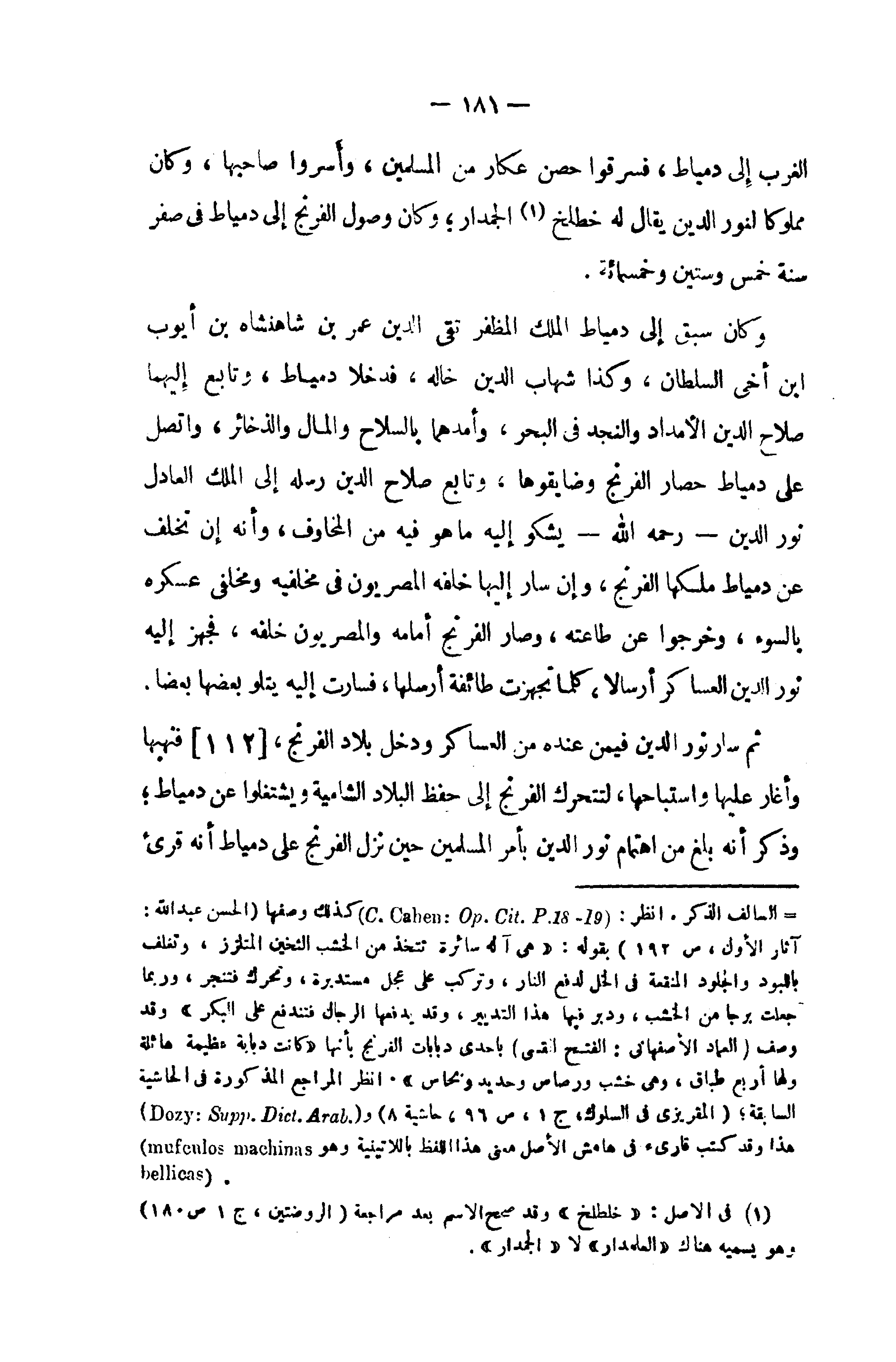 = السالف الذكر، انظر: (C .Cahen : Op .Cit . P. 18 - 19) كذلك وصفها (الحسن عبد الله: آثار الأول، ص 192) بقوله: «هى آله سائرة تتخذ من الخشب الثخين المتلزز، وتغلف باللبود والجلود المنقعة في الخل لدفع النار، وتركب على عجل مستديرة، وتحرك فتنجر، وربما جعلت برجا من الخشب، ودبر فيها هذا التديير، وقد يدفعها الرجال فتندفع على البكر» وقد وصف (العماد الأصفهانى: الفتح القسى) باحدى دبابات الفرنج بأنها «كانت دبابة عظيمة هائلة ولها أربع طباق، وهى خشب ورصاص وحديد ونحاس». انظر المراجع المذكورة في الحاشية السابقة؛ (المقريزى في السلوك، ج 1، ص 96، حاشية 8) و (Dozy : Supp .Dict .Arab)
