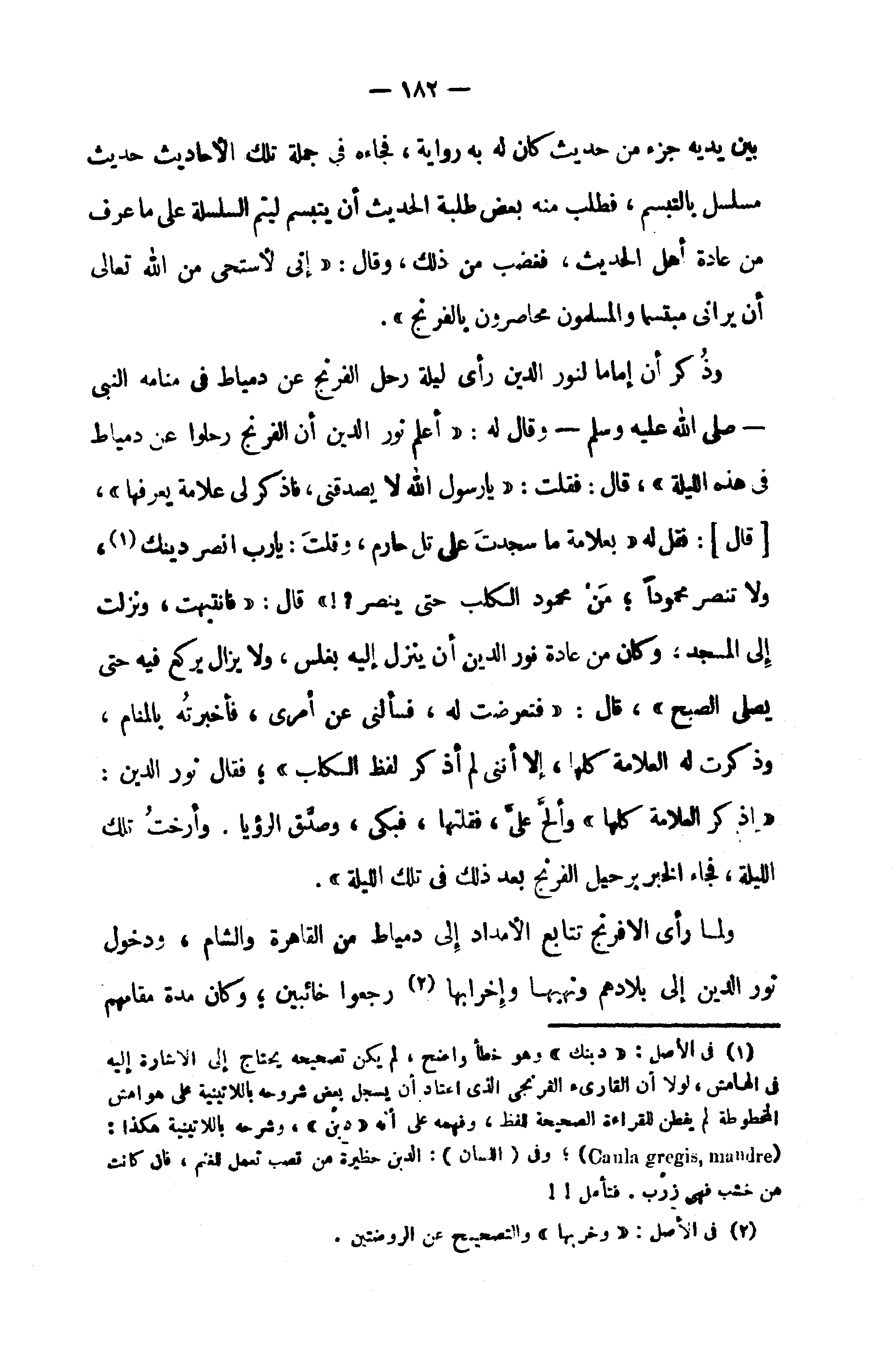 وذكر أن إماما لنور الدين رأى ليلة رحل الفرنج عن دمياط في منامه النبى - صلى الله عليه وسلم - وقال له: «أعلم نور الدين أن الفرنج رحلوا عن دمياط في هذه الليلة»، قال: فقلت: «يا رسول الله لا يصدقنى، فاذكر لى علامة يعرفها»، [قال]: فقل له «بعلامة ما سجدت على تل حارم، وقلت: يا رب انصر دينك (¬1)، ولا تنصر محمودا؛ من محمود الكلب حتى ينصر؟!» قال: «فانتبهت، ونزلت إلى المسجد، وكان من عادة نور الدين أن ينزل إليه بغلس، ولا يزال يركع فيه حتى يصلى الصبح»، قال: «فتعرضت له، فسألنى عن أمرى، فأخبرته بالمنام، وذكرت له العلامة كلها، إلا أننى لم أذكر لفظ الكلب»؛ فقال نور الدين: «اذكر العلامة كلها» وألحّ علىّ، فقلتها، فبكى، وصدّق الرؤيا. وأرخت تلك الليلة، فجاء الخبر برحيل الفرنج بعد ذلك في تلك الليلة».