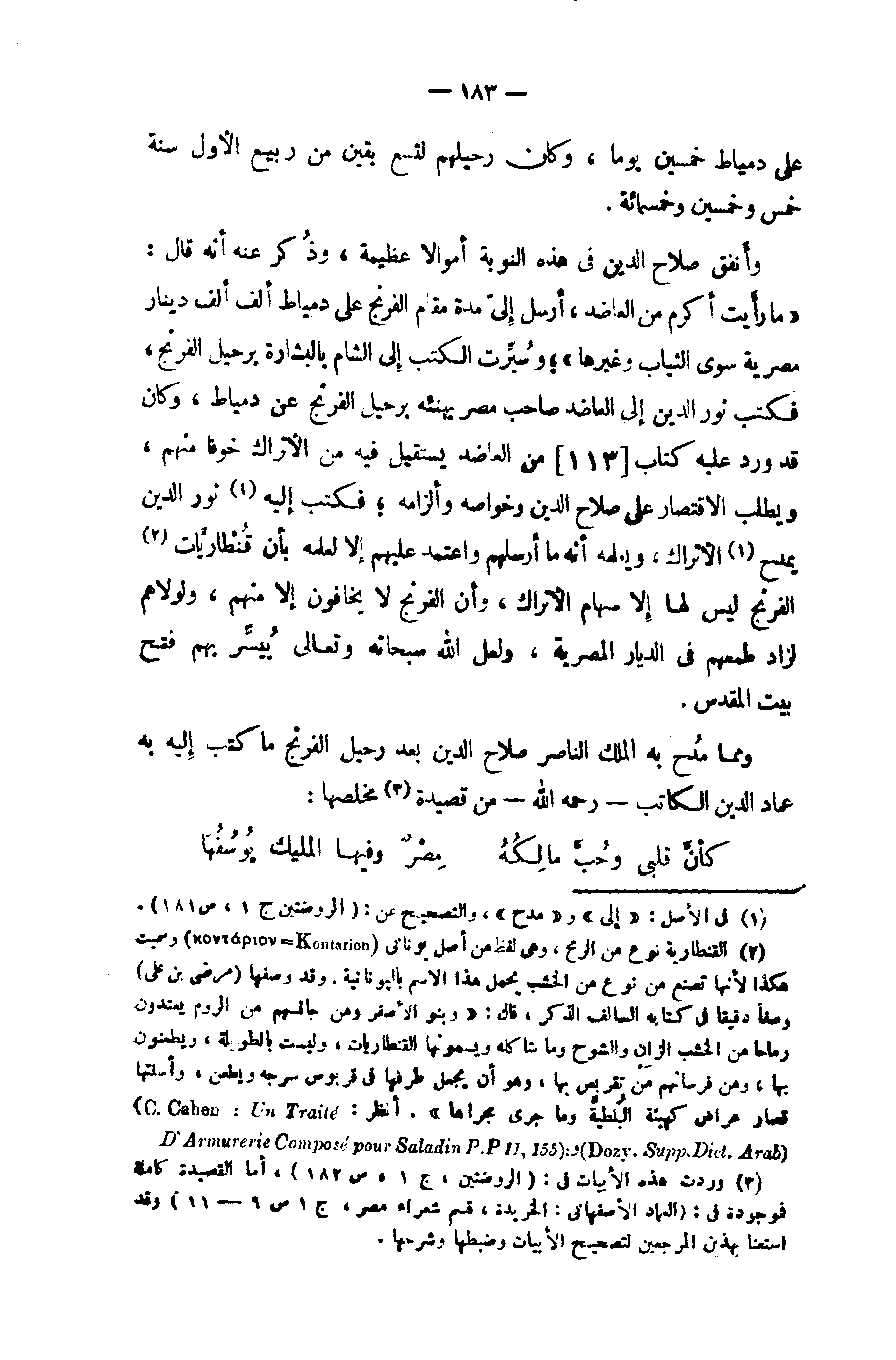 (¬2) القنطارية نوع من الرمح، وهى لفظ من أصل يونانى (Kontarion) وسميت هكذا لأنها تصنع من نوع من الخشب يحمل هذا الاسم باليونانية. وقد وصفها (مرضى بن على) وصفا دقيقا في كتابه السالف الذكر، قال: «وبنو الأصفر ومن جالسهم من الروم يعتدون وماحا من الخشب الزان والشوح وما شاكله ويسمونها القنطاريات، وليست بالطويلة، ويطعنون بها، ومن فرسانهم من تقربص بها، وهو أن يجعل طرفها في قربوص سرجه ويطعن، وأسنتها قصار عراض كهيئة البلطيّة وما جرى مجراها». أنظر: (C .Cahen : Un Traite D'Armurerie Composepour Saladin P. P 11,155)