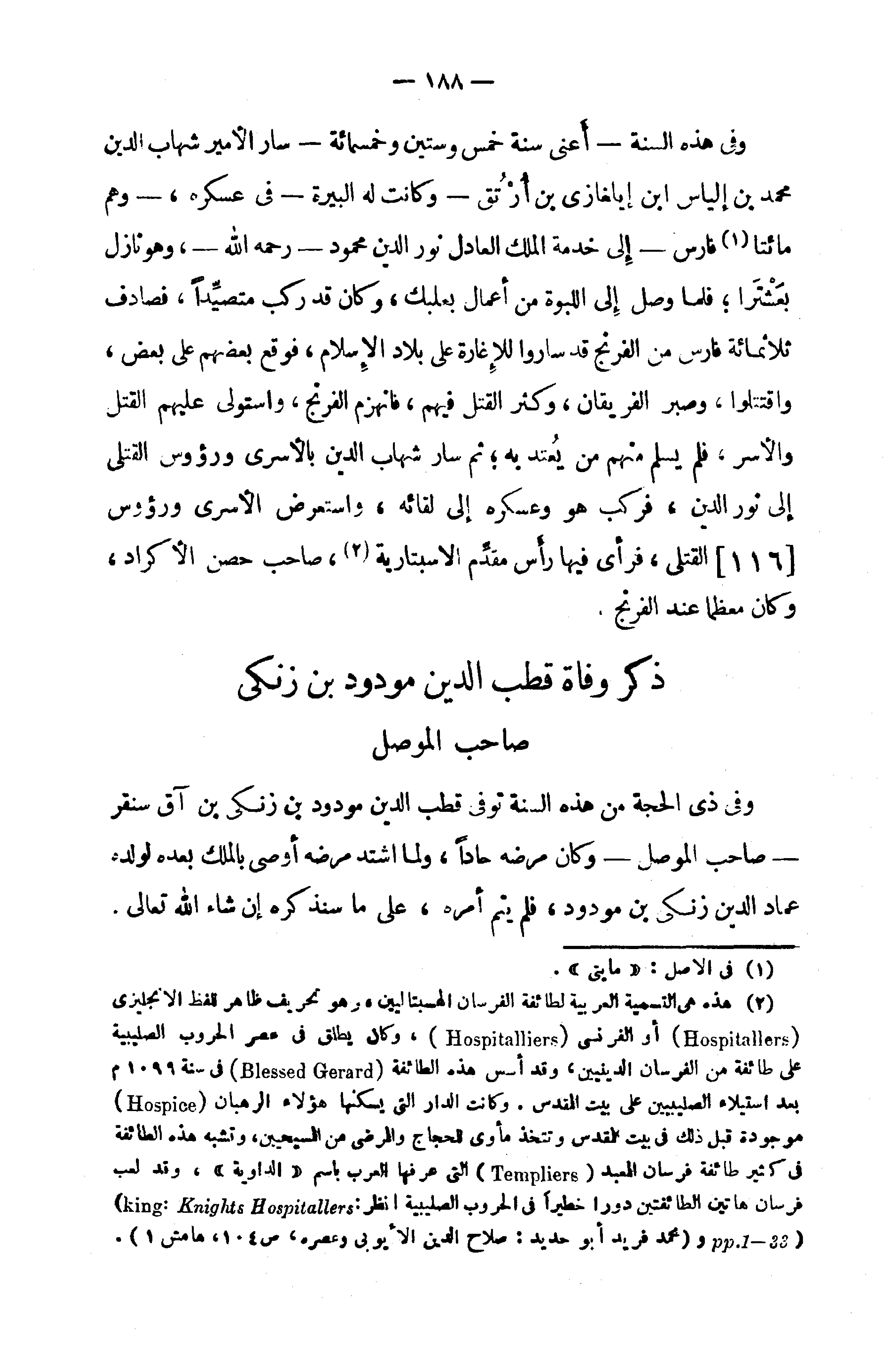(¬2) هذه هى التسمية العربية لطائفة الفرسان الهسبتاليين، وهو تحريف ظاهر للفظ الانجليزى (Hospitallers) أو الفرنسى، (Hospitalliers) وكان يطلق في عصر الحروب الصليبية على طائفة من الفرسان الدينيين، وقد أسس هذه الطائفة (Blessed Gerard) في سنة 1099 م بعد استيلاء الصليبيين على بيت المقدس. وكانت الدار التي يسكنها هؤلاء الرهبان (Hospice) موجودة قبل ذلك في بيت المقدس وتتخذ مأوى للحجاج والمرضى من المسيحيين، وتشبه هذه الطائفة في كثير طائفة فرسان المعبد (Templiers) التي عرفها العرب باسم «الداوية»، وقد لعب فرسان هاتين الطائفتين دورا خطيرا في الحروب الصليبية انظر: (King: Knights Hospitallers pp .1 - 33) و (محمد فريد أبو حديد: صلاح الدين الأيوبى وعصره، ص 104، هامش 1).