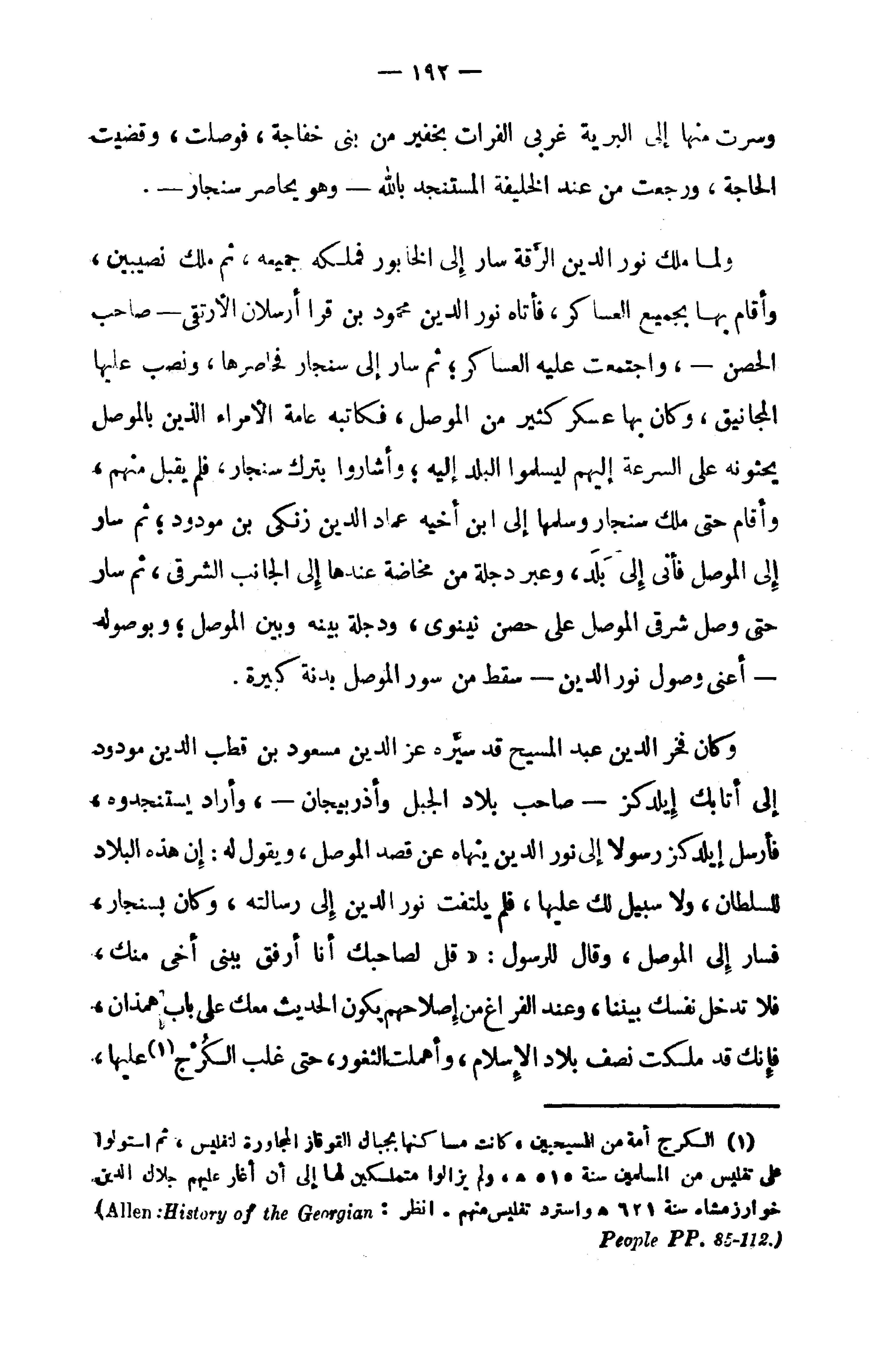 (¬1) الكرج أمة من المسيحيين، كانت مساكنها بجبال القوقاز المجاورة لتفليس، ثم استولوا على تفليس من المسلمين سنة 515 هـ، ولم يزالوا متملكين لها إلى أن أغار عليهم جلال الدين خوارزمشاه سنة 621 هـ واسترد تفليس منهم. انظر: (Allen : History of the Georgian People PP .85 - 112) .