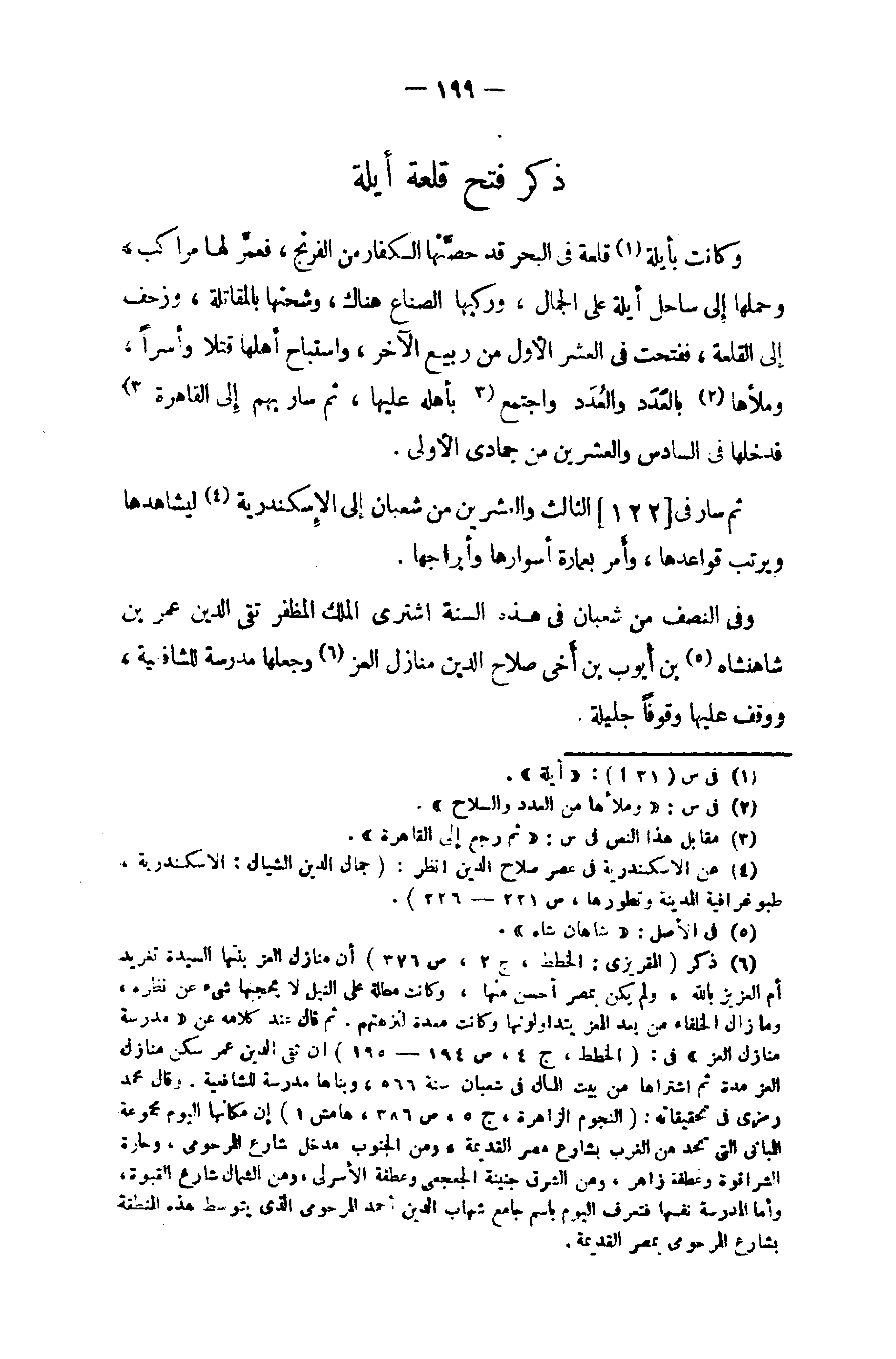 وكانت بأيلة (¬1) قلعة في البحر قد حصّنها الكفار من الفرنج، فعمّر لها مراكب، وحملها إلى ساحل أيلة على الجمال، وركبها الصناع هناك، وشحنها بالمقاتلة، وزحف إلى القلعة، ففتحت في العشر الأول من ربيع الآخر، واستباح أهلها قتلا وأسرا، وملأها (¬2) بالعدد والعدد واجتمع (¬3) بأهله عليها، ثم سار بهم إلى القاهرة (3) فدخلها في السادس والعشرين من جمادى الأولى.