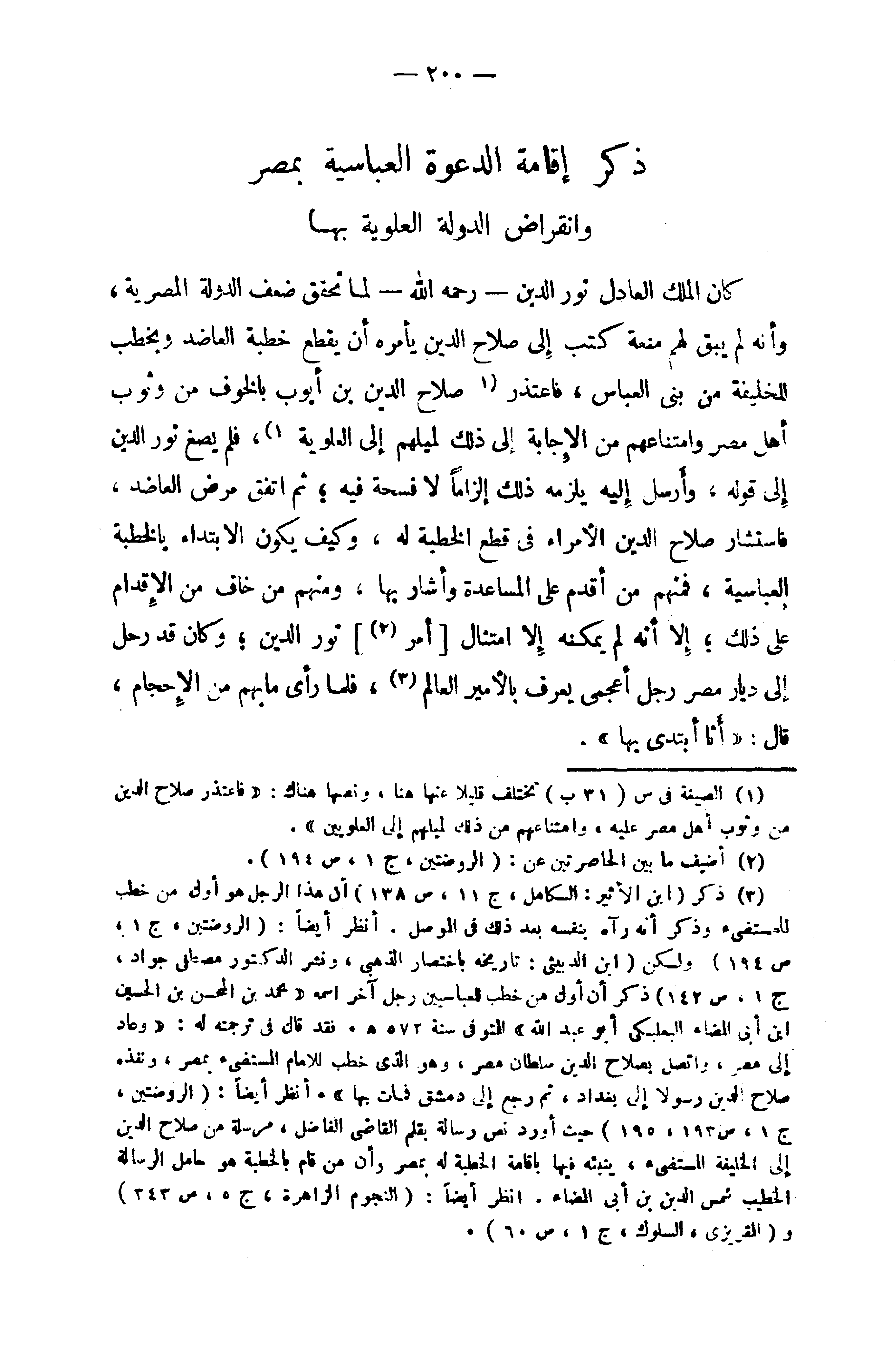 (¬3) ذكر (ابن الأثير: الكامل، ج 11، ص 138) أن هذا الرجل هو أول من خطب للمستضىء وذكر أنه رآه بنفسه بعد ذلك في الموصل. أنظر أيضا: (الروضتين، ج 1، ص 194) ولكن (ابن الدبيثى: تاريخه باختصار الذهبى، ونشر الدكتور مصطفى جواد، ج 1، ص 142) ذكر أن أول من خطب للعباسيين رجل آخر اسمه «محمد بن المحسن بن الحسين ابن أبى المضاء البعلبكى أبو عبد الله» المتوفى سنة 572 هـ. فقد قال في ترجمته له: «وعاد إلى مصر، واتصل بصلاح الدين سلطان مصر، وهو الذى خطب للامام المستضىء بمصر، ونفذه صلاح الدين رسولا إلى بغداد، ثم رجع إلى دمشق فمات بها». أنظر أيضا: (الروضتين، ج 1، ص 193، 195) حيث أورد نص رسالة بقلم القاضى الفاضل، مرسلة من صلاح الدين إلى الخليفة المستضىء، ينبئه فيها باقامة الخطبة له بمصر وأن من قام بالخطبة هو حامل الرسالة الخطيب شمس الدين بن أبى المضاء. انظر أيضا: (النجوم الزاهرة، ج 5، ص 343) و (المقريزى، السلوك، ج 1، ص 60).