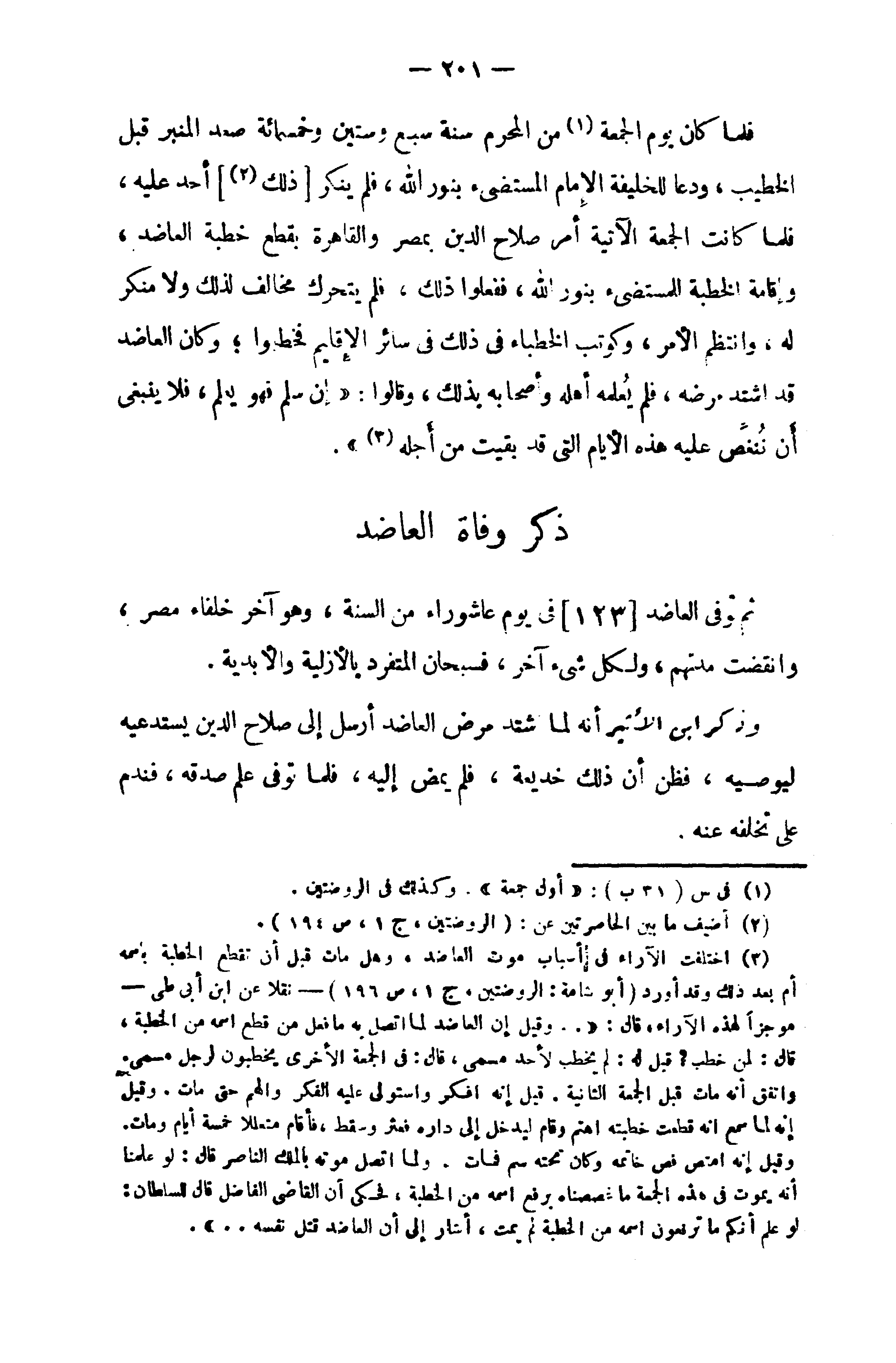(¬3) اختلفت الآراء في أسباب موت العاضد، وهل مات قبل أن تقطع الخطبة باسمه أم بعد ذلك وقد أورد (أبو شامة: الروضتين، ج 1، ص 196) - نقلا عن ابن أبى طى - موجزا لهذه الآراء، قال: «. . . وقيل إن العاضد لما اتصل به ما فعل من قطع اسمه من الخطبة، قال: لمن خطب؟ قيل له: لم يخطب لأحد مسمى، قال: في الجمعة الأخرى يخطبون لرجل مسمى. واتفق أنه مات قبل الجمعة الثانية. قيل إنه افكر واستولى عليه الفكر والهم حتى مات. وقيل إنه لما سمع انه قطعت خطبته اهتم وقام ليدخل إلى داره فعثر وسقط، فأقام متعللا خمسة أيام ومات. وقيل إنه امتص فص خاتمه وكان تحته سم فمات. ولما اتصل موته بالملك الناصر قال: لو علمنا أنه يموت في هذه الجمعة ما غصصناه برفع اسمه من الخطبة، فحكى أن القاضى الفاضل قال للسلطان: لو علم أنكم ما ترفعون اسمه من الخطبة لم يمت، أشار إلى أن العاضد قتل نفسه. . .».