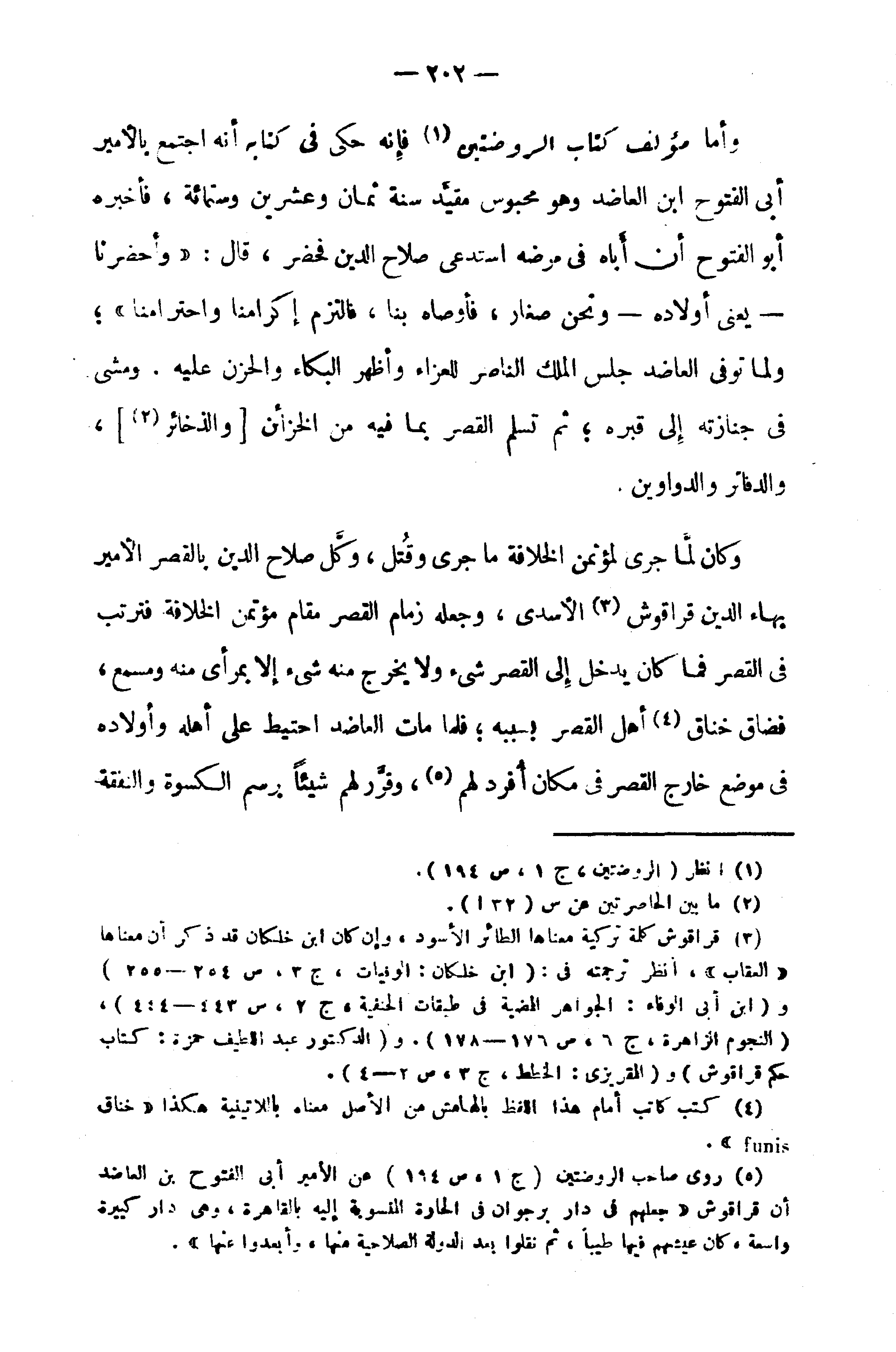 (¬3) قراقوش كلمة تركية معناها الطائر الأسود، وإن كان ابن خلكان قد ذكر أن معناها «العقاب»، أنظر ترجمته في: (ابن خلكان: الوفيات، ج 3، ص 254 - 255) و (ابن أبى الوفاء: الجواهر المضية في طبقات الحنفية، ج 2، س 443 - 444)، (النجوم الزاهرة، ج 6، ص 176 - 178). و (الدكتور عبد اللطيف حمزة: كتاب حكم قراقوش) و (المقريزى: الخطط، ج 3، ص 2 - 4).