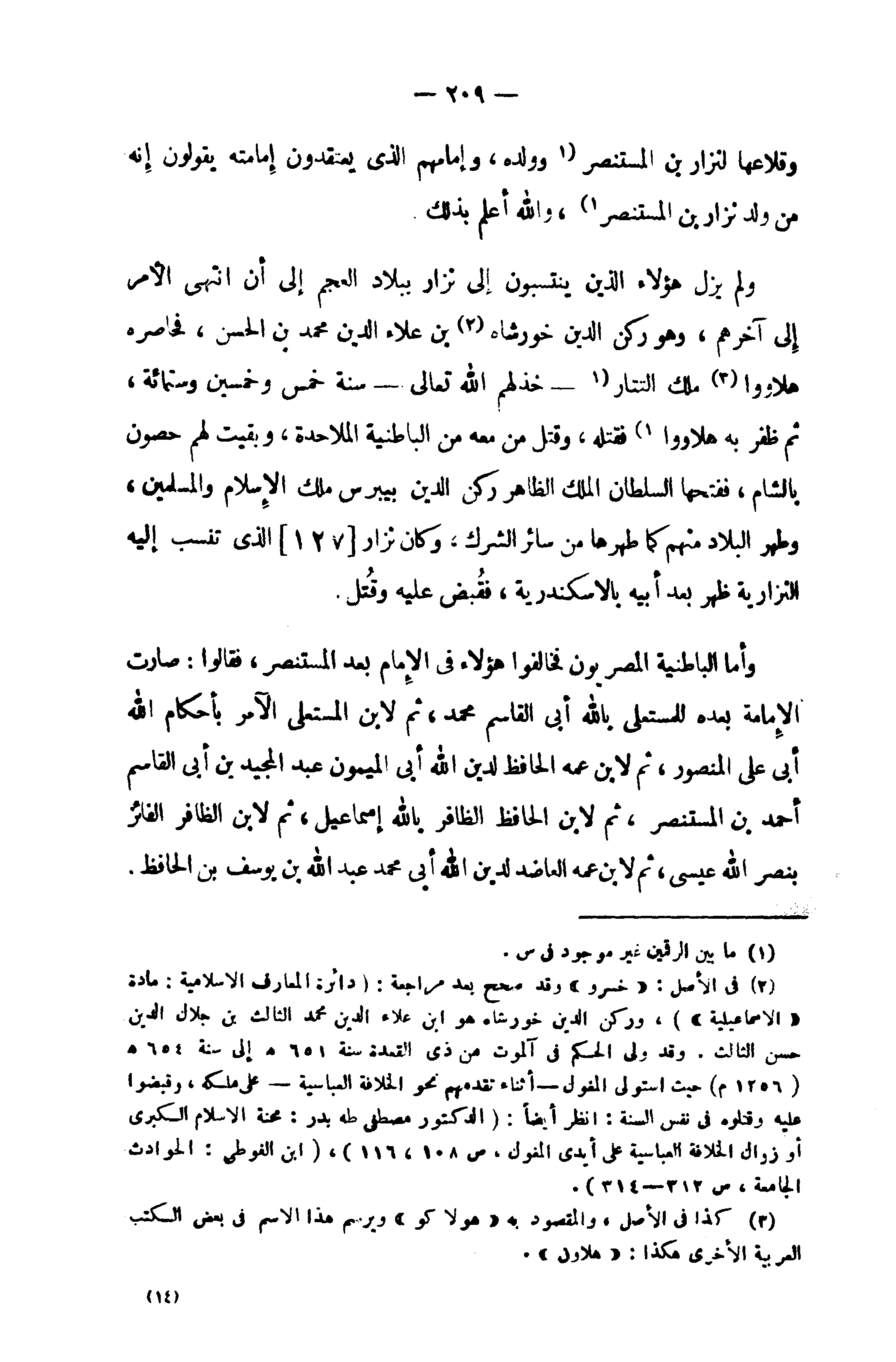 (¬2) في الأصل: «خسرو» وقد صحح بعد مراجعة: (دائرة المعارف الاسلامية: مادة «الاسماعيلية»)، وركن الدين خورشاه هو ابن علاء الدين محمد الثالث بن جلال الدين حسن الثالث. وقد ولى الحكم في آلموت من ذى القعدة سنة 651 هـ إلى سنة 654 هـ (1256 م) حيث استولى المغول - أثناء تقدمهم نحو الخلافة العباسية - على ملكه، وقبضوا عليه وقتلوه في نفس السنة: انظر أيضا: (الدكتور مصطفى طه بدر: محنة الاسلام الكبرى أو زوال الخلافة العباسية على أيدى المغول، ص 108، 116)، (ابن الفوطى: الحوادث الجامعة، ص 312 - 314).