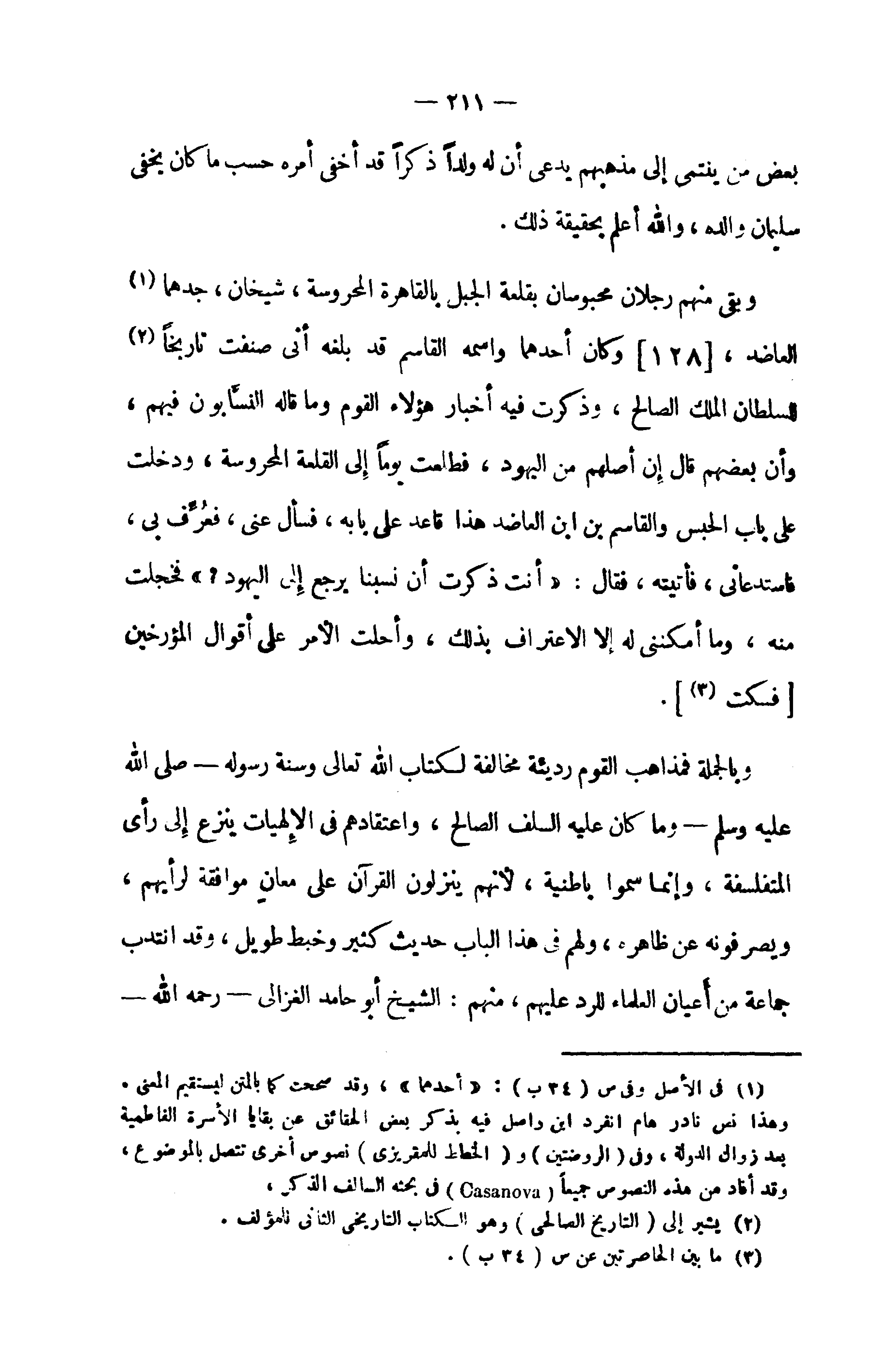 (¬1) في الأصل وفى س (34 ب): «أحدهما»، وقد صححت كما بالمتن ليستقيم المعنى. وهذا نص نادر هام انفرد ابن واصل فيه بذكر بعض الحقائق عن بقايا الأسرة الفاطمية بعد زوال الدولة، وفى (الروضتين) و (الخطط للمقريزى) نصوص أخرى تتصل بالموضوع، وقد أفاد من هذه النصوص جميعا (Casanova) في بحثه السالف الذكر،