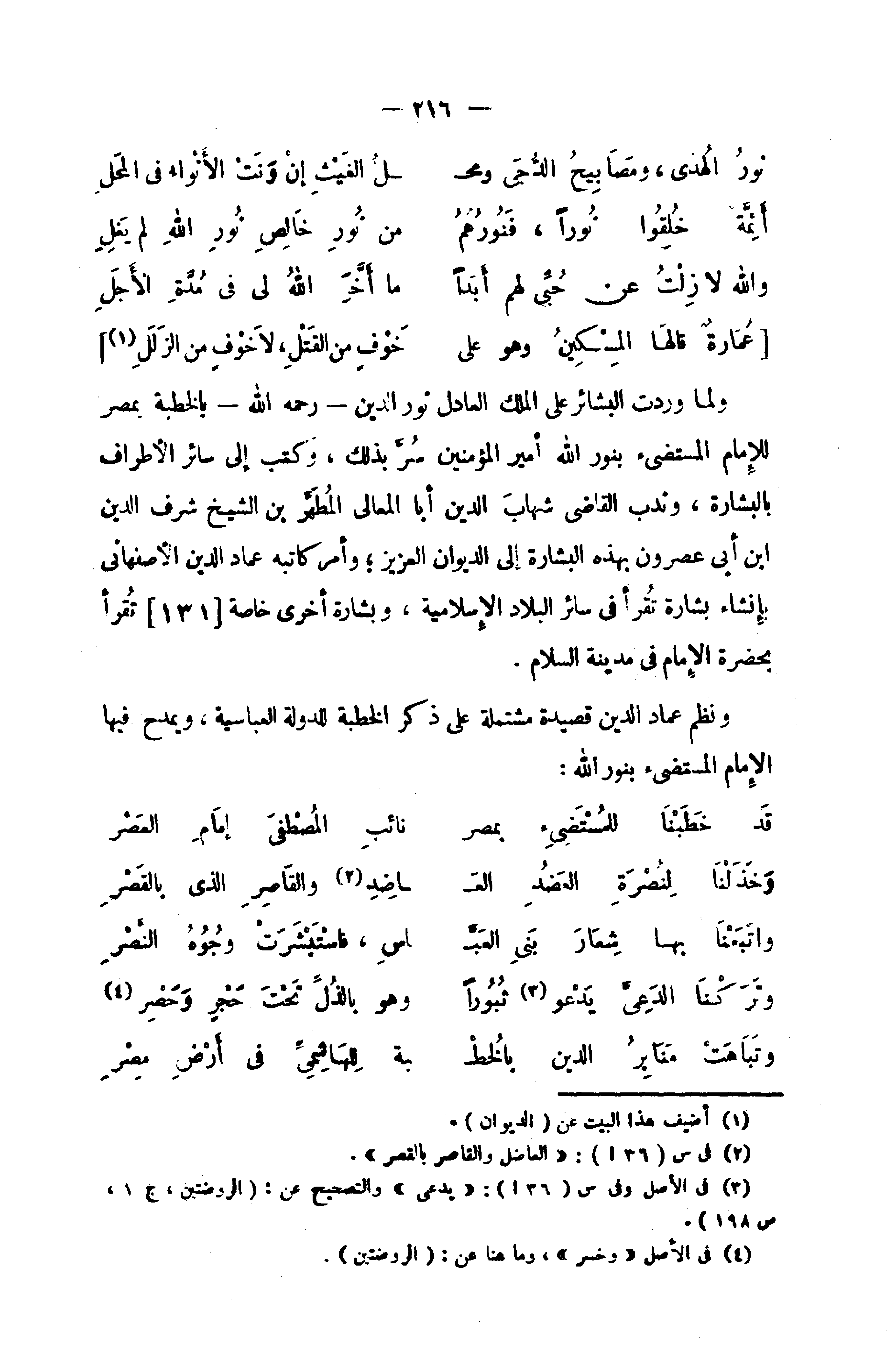 ونظم عماد الدين قصيدة مشتملة على ذكر الخطبة للدولة العباسية، ويمدح فيها الإمام المستضىء بنور الله: