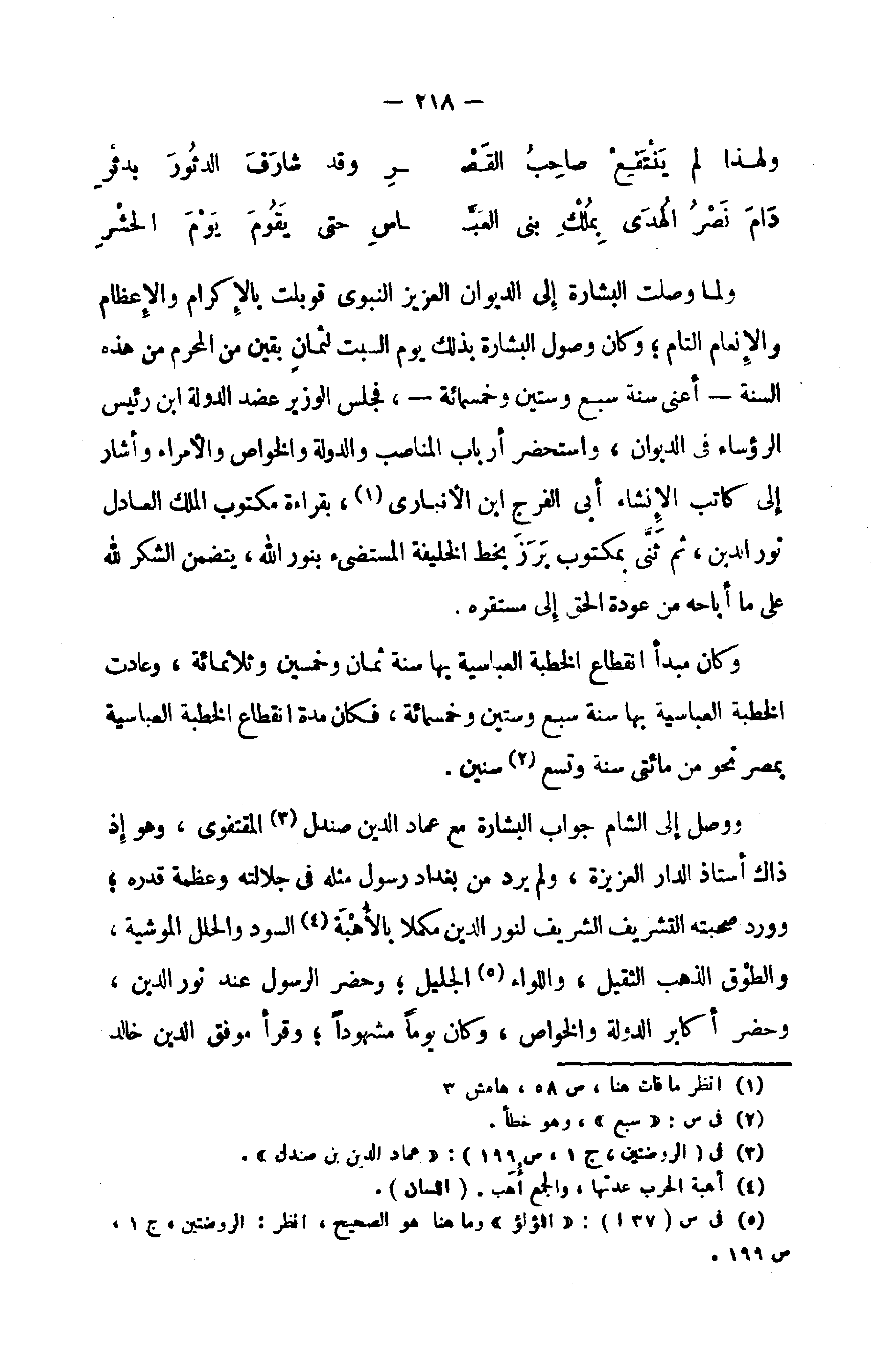 وكان مبدأ انقطاع الخطبة العباسية بها سنة ثمان وخمسين وثلاثمائة، وعادت الخطبة العباسية بها سنة سبع وستين وخمسمائة، فكان مدة انقطاع الخطبة العباسية بمصر نحو من مائتى سنة وتسع (¬2) سنين.