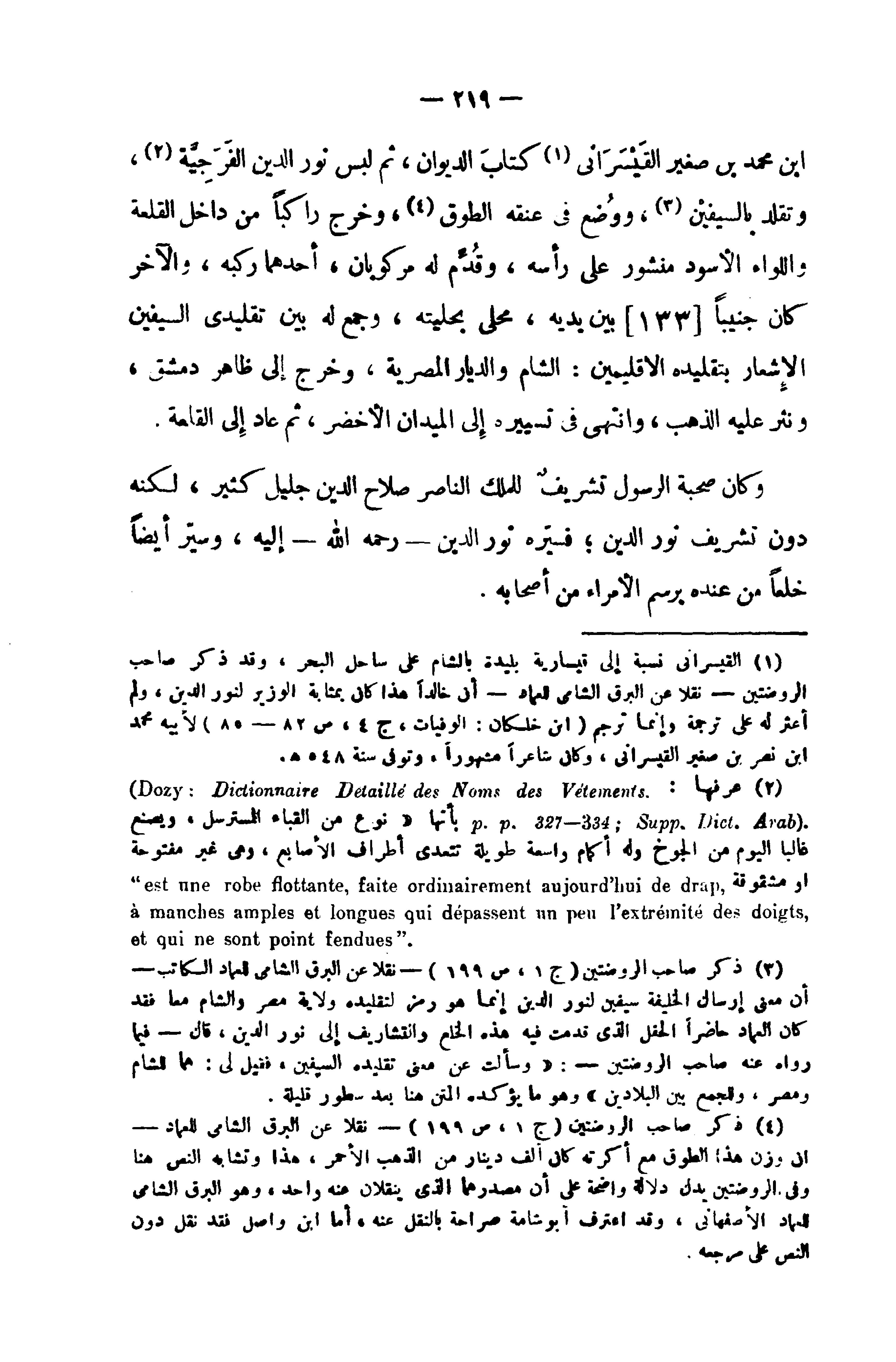 (¬3) ذكر صاحب الروضتين (ج 1، ص 199) - نقلا عن البرق الشامى للعماد الكاتب - أن معنى إرسال الخليفة سيفين لنور الدين إنما هو رمز لتقليده ولاية مصر والشام معا فقد كان العماد حاضرا الحفل الذى قدمت فيه هذه الخلع والتشاريف إلى نور الدين، قال - فيما رواه عنه صاحب الروضتين -: «وسألت عن معنى تقليده السيفين، فقيل لى: هما للشام ومصر، وللجمع بين البلادين» وهو ما يؤكده المتن هنا بعد سطور قليلة.