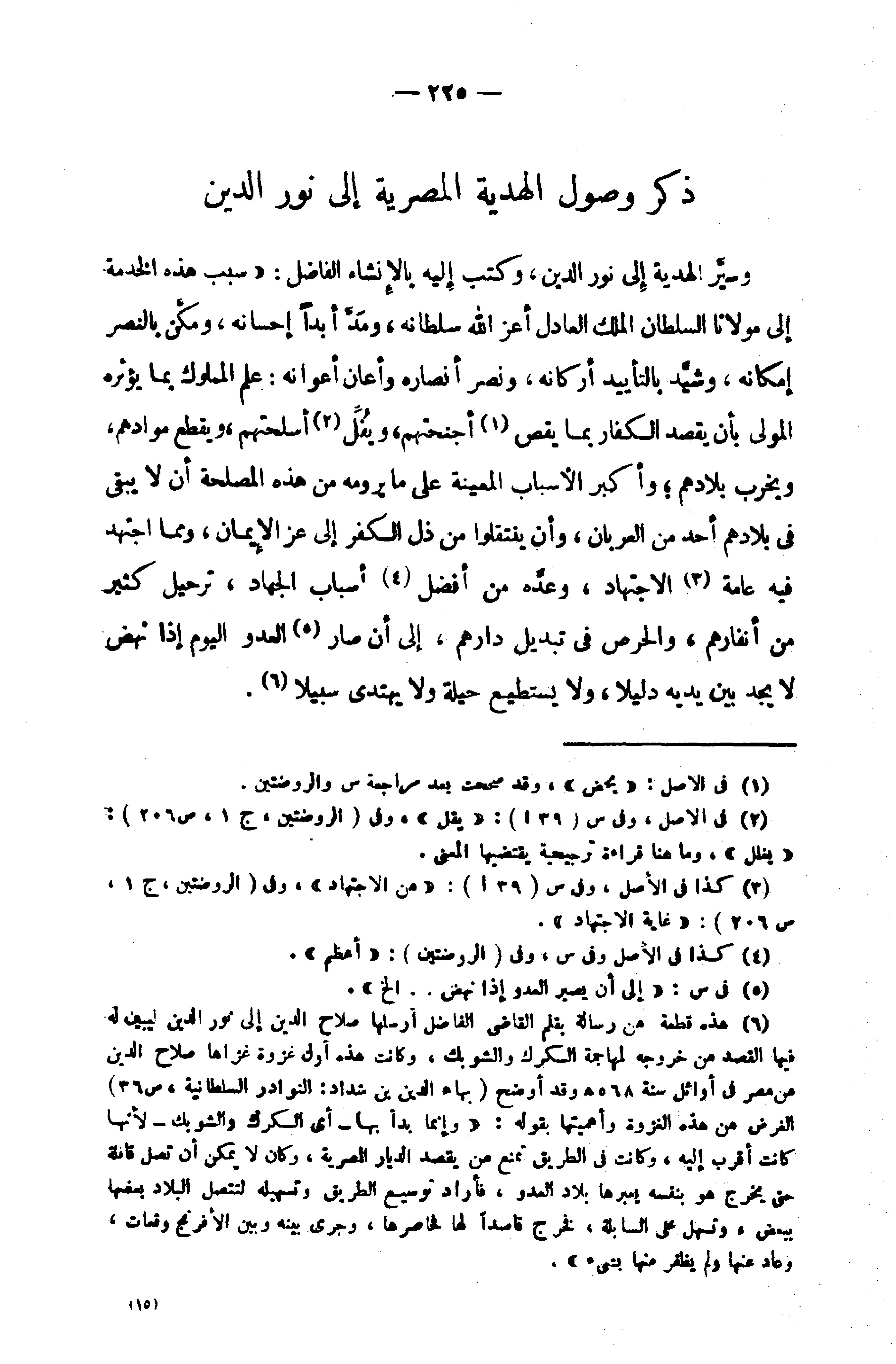 (¬6) هذه قطعة من رسالة بقلم القاضى الفاضل أرسلها صلاح الدين إلى نور الدين ليبين له فيها القصد من خروجه لمهاجمة الكرك والشوبك، وكانت هذه أول غزوة غزاها صلاح الدين من مصر في أوائل سنة 568 هـ وقد أوضح (بهاء الدين بن شداد: النوادر السلطانية، ص 36) الغرض من هذه الغزوة وأهميتها بقوله: «وإنما بدأ بها - أي الكرك والشوبك - لأنها كانت أقرب إليه، وكانت في الطريق تمنع من يقصد الديار المصرية، وكان لا يمكن أن تصل قافلة حتى يخرج هو بنفسه يعبرها بلاد العدو، فأراد توسيع الطريق وتسهيله لتتصل البلاد بعضها ببعض، وتسهل على السابلة، فخرج قاصدا لها فحاصرها، وجرى بينه وبين الأفرنج وقعات، وعاد عنها ولم يظفر منها بشىء».