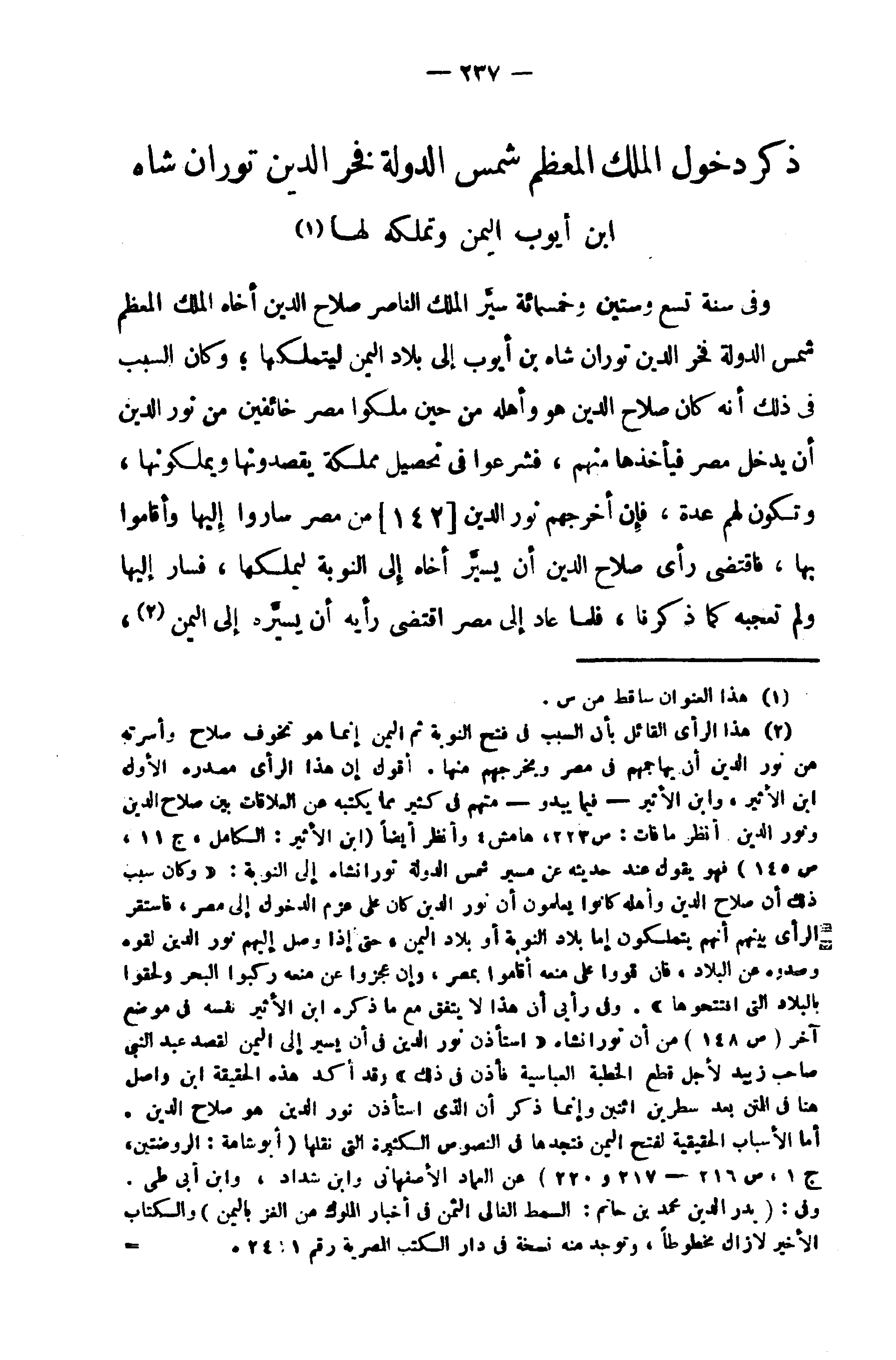 (¬2) هذا الرأى القائل بأن السبب في فتح النوبة ثم اليمن إنما هو تخوف صلاح وأسرته من نور الدين أن يهاجمهم في مصر ويخرجهم منها. أقول إن هذا الرأى مصدره الأول ابن الأثير، وابن الأثير - فيما يبدو - متهم في كثير مما يكتبه عن العلاقات بين صلاح الدين ونور الدين أنظر ما فات: ص 223، هامش 4 وأنظر أيضا (ابن الأثير: الكامل، ج 11، ص 145) فهو يقول عند حديثه عن مسير شمس الدولة تورانشاه إلى النوبة: «وكان سبب ذلك أن صلاح الدين وأهله كانوا يعلمون أن نور الدين كان على عزم الدخول إلى مصر، فاستقر الرأى بينهم أنهم يتملكون إما بلاد النوبة أو بلاد اليمن، حتى إذا وصل إليهم نور الدين لقوه وصدوه عن البلاد، فان قووا على منعه أقاموا بمصر، وإن عجزوا عن منعه ركبوا البحر ولحقوا بالبلاد التي افتتحوها». وفى رأيى أن هذا لا يتفق مع ما ذكره ابن الأثير نفسه في موضع آخر (ص 148) من أن تورانشاه «استأذن نور الدين في أن يسير إلى اليمن لقصد عبد النبى صاحب زبيد لأجل قطع الخطبة العباسية فأذن في ذلك» وقد أكد هذه الحقيقة ابن واصل هنا في المتن بعد سطرين اثنين وإنما ذكر أن الذى استأذن نور الدين هو صلاح الدين. أما الأسباب الحقيقية لفتح اليمن فتجدها في النصوص الكثيرة التي نقلها (أبو شامة: الروضتين، ج 1، ص 216 - 217 و 220) عن العماد الأصفهانى وابن شداد، وابن أبى طى. وفى: (بدر الدين محمد بن حاتم: السمط الغالى الثمن في أخبار الملوك من الغز باليمن) والكتاب الأخير لا زال مخطوطا، وتوجد منه نسخة في دار الكتب المصرية رقم 2411. =