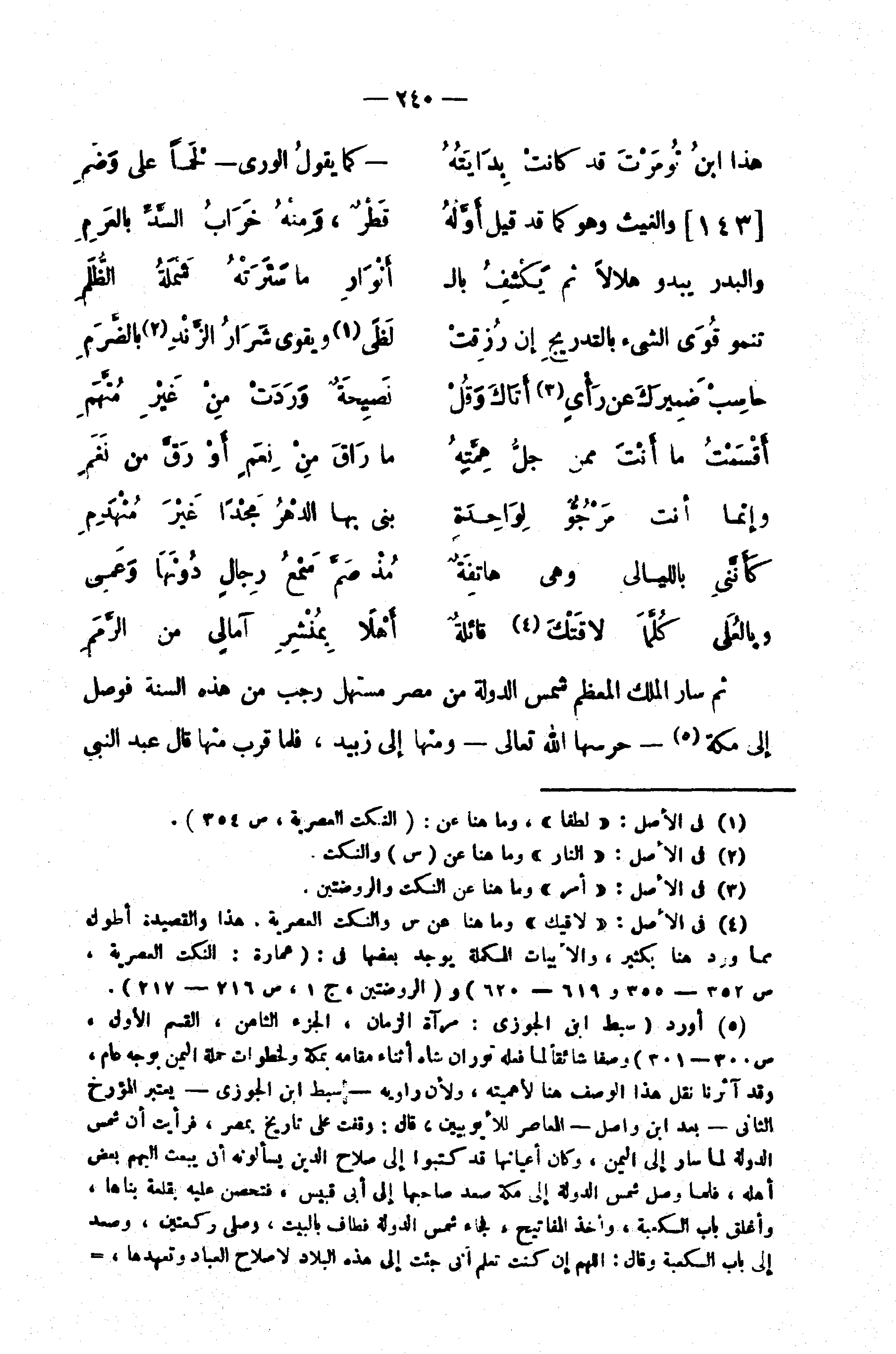 (¬5) أورد (سبط ابن الجوزى: مرآة الزمان، الجزء الثامن، القسم الأول، ص 300 - 301) وصفا شائقا لما فعله توران شاه أثناء مقامه بمكة ولخطوات حملة اليمن بوجه عام، وقد آثرنا نقل هذا الوصف هنا لأهميته، ولأن راويه - سبط ابن الجوزى - يعتبر المؤرخ الثانى - بعد ابن واصل - المعاصر للأيوبيين، قال: وقفت على تاريخ بمصر، فرأيت أن شمس الدولة لما سار إلى اليمن، وكان أعيانها قد كتبوا إلى صلاح الدين يسألونه أن يبعث اليهم بعض أهله، فلما وصل شمس الدولة إلى مكة صعد صاحبها إلى أبى قبيس، فتحصن عليه بقلعة بناها، وأغلق باب الكعبة، وأخذ المفاتيح، فجاء شمس الدولة فطاف بالبيت، وصلى ركعتين، وصعد إلى باب الكعبة وقال: اللهم إن كنت تعلم أنى جئت إلى هذه البلاد لاصلاح العباد وتعهدها، =