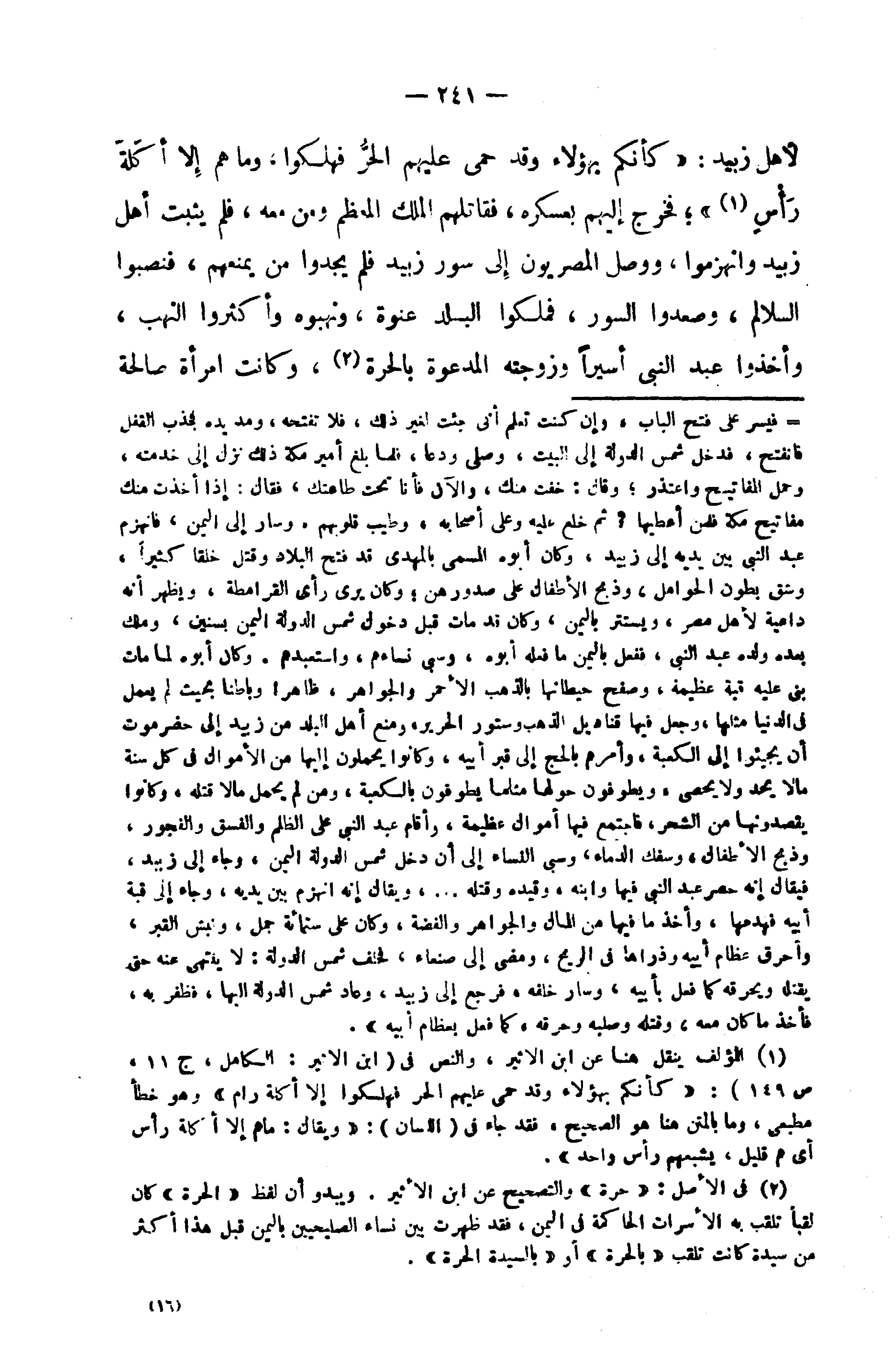 (¬2) في الأصل: «حرة» والتصحيح عن ابن الأثير. ويبدو أن لفظ «الحرة» كان لقبا تلقب به الأسرات الحاكمة في اليمن، فقد ظهرت بين نساء الصليحيين باليمن قبل هذا أكثر من سيدة كانت تلقب «بالحرة» أو «بالسيدة الحرة».