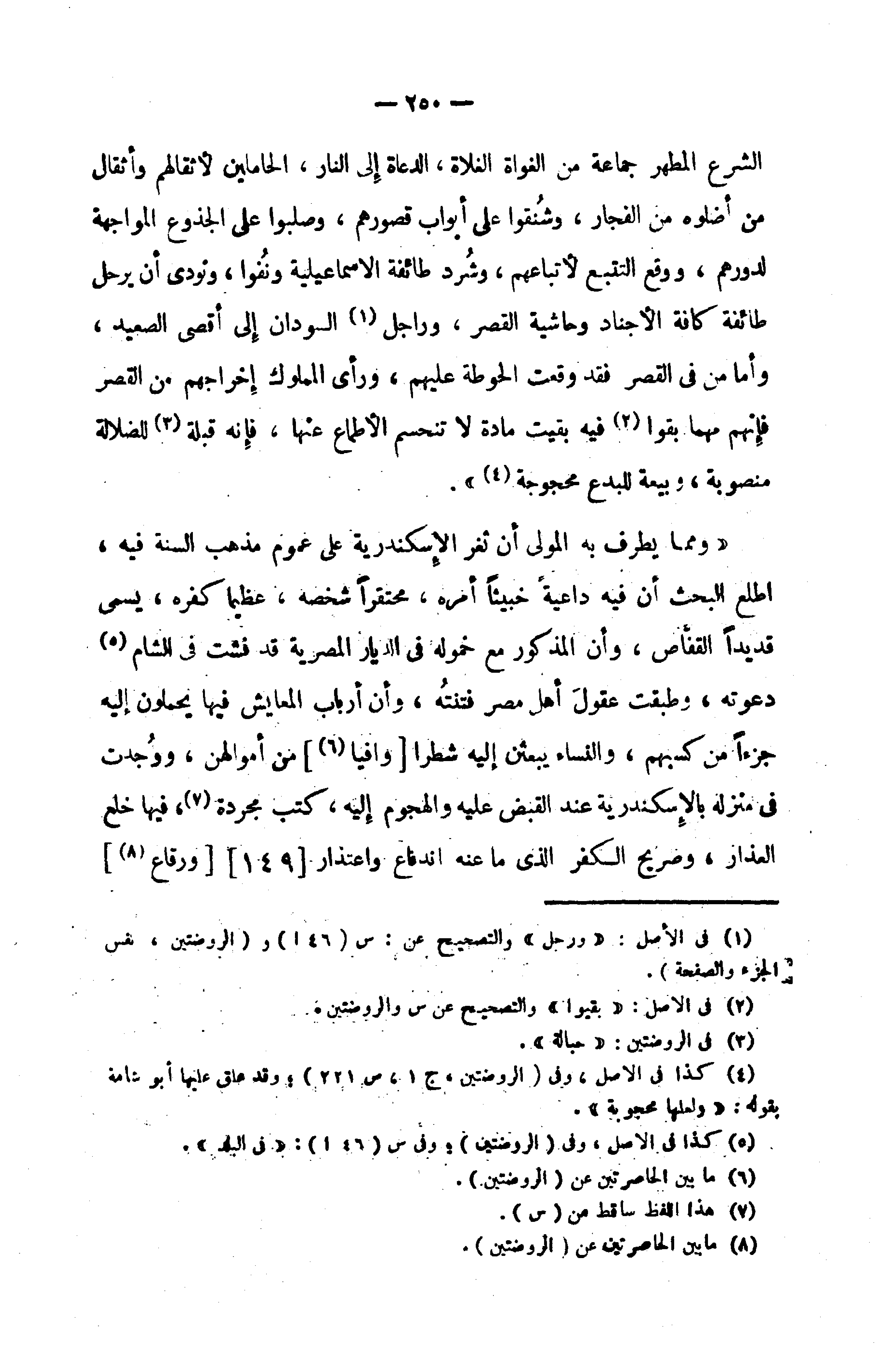الشرع المطهر جماعة من الغواة الغلاة، الدعاة إلى النار، الحاملين لأثقالهم وأثقال من أضلوه من الفجار، وشنقوا على أبواب قصورهم، وصلبوا على الجذوع المواجهة لدورهم، ووقع التتبع لأتباعهم، وشرد طائفة الاسماعيلية ونفوا، ونودى أن يرحل طائفة كافة الأجناد وحاشية القصر، وراجل (¬1) السودان إلى أقصى الصعيد، وأما من في القصر فقد وقعت الحوطة عليهم، ورأى المملوك إخراجهم من القصر فإنهم مهما بقوا (¬2) فيه بقيت مادة لا تنحسم الأطماع عنها، فإنه قبلة (¬3) للضلالة منصوبة، وبيعة للبدع محجوجة (¬4)».
