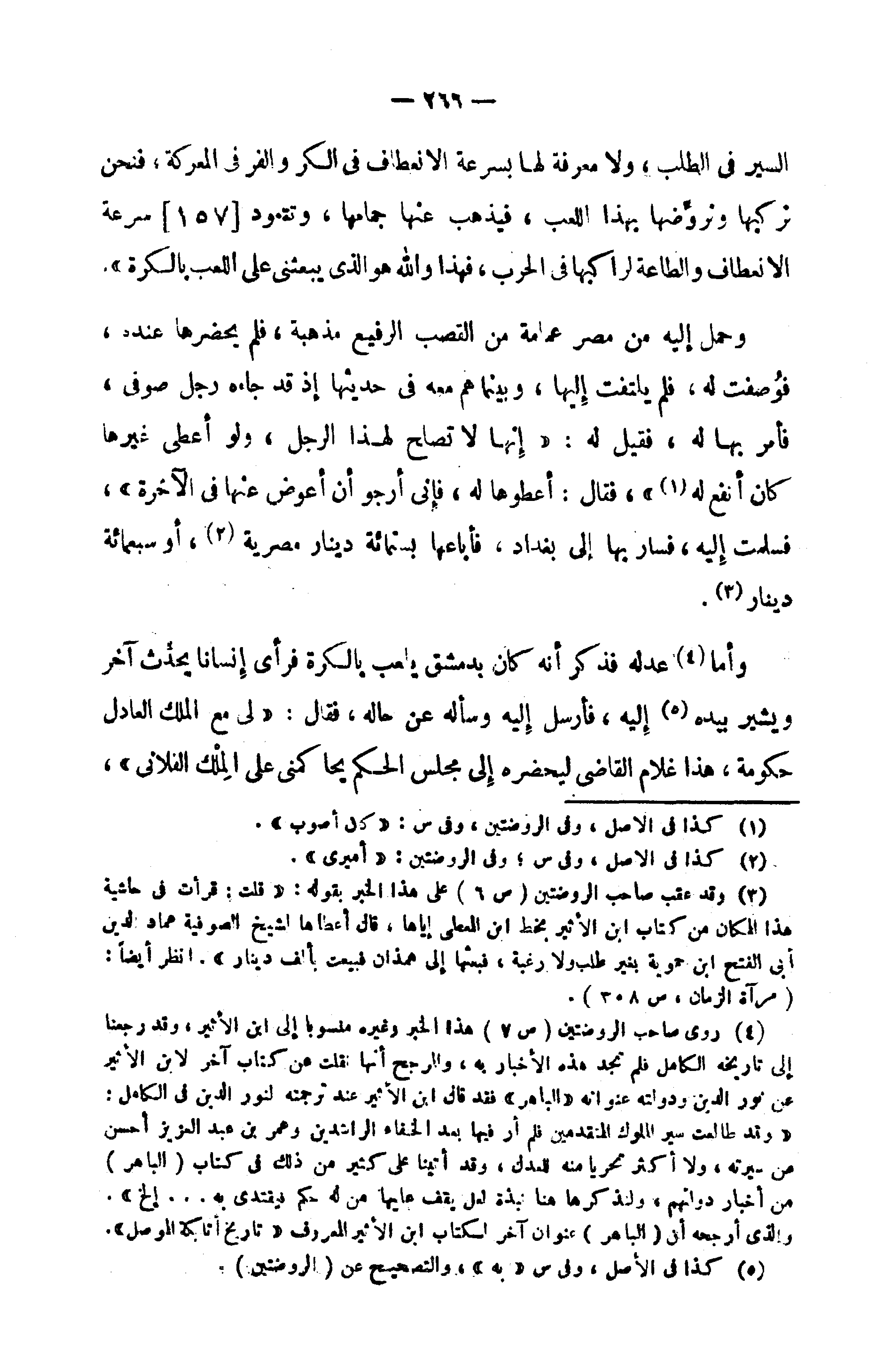 (¬4) روى صاحب الروضتين (ص 7) هذا الخبر وغيره منسوبا إلى ابن الأثير، وقد رجعنا إلى تاريخه الكامل فلم تجد هذه الأخبار به، والمرجح أنها نقلت عن كتاب آخر لابن الأثير عن نور الدين ودولته عنوانه «الباهر» فقد قال ابن الأثير عند ترجمته لنور الدين في الكامل: «وقد طالعت سير الملوك المتقدمين فلم أر فيها بعد الخلفاء الراشدين وعمر بن عبد العزيز أحسن من سيرته، ولا أكثر تحريا منه للعدل، وقد أتينا على كثير من ذلك في كتاب (الباهر) من أخبار دولتهم، ولنذكرها هنا نبذة لعل يقف عليها من له حكم فيقتدى به. . . إلخ». والذى أرجحه أن (الباهر) عنوان آخر لكتاب ابن الأثير المعروف «تاريخ أتابكة الموصل».