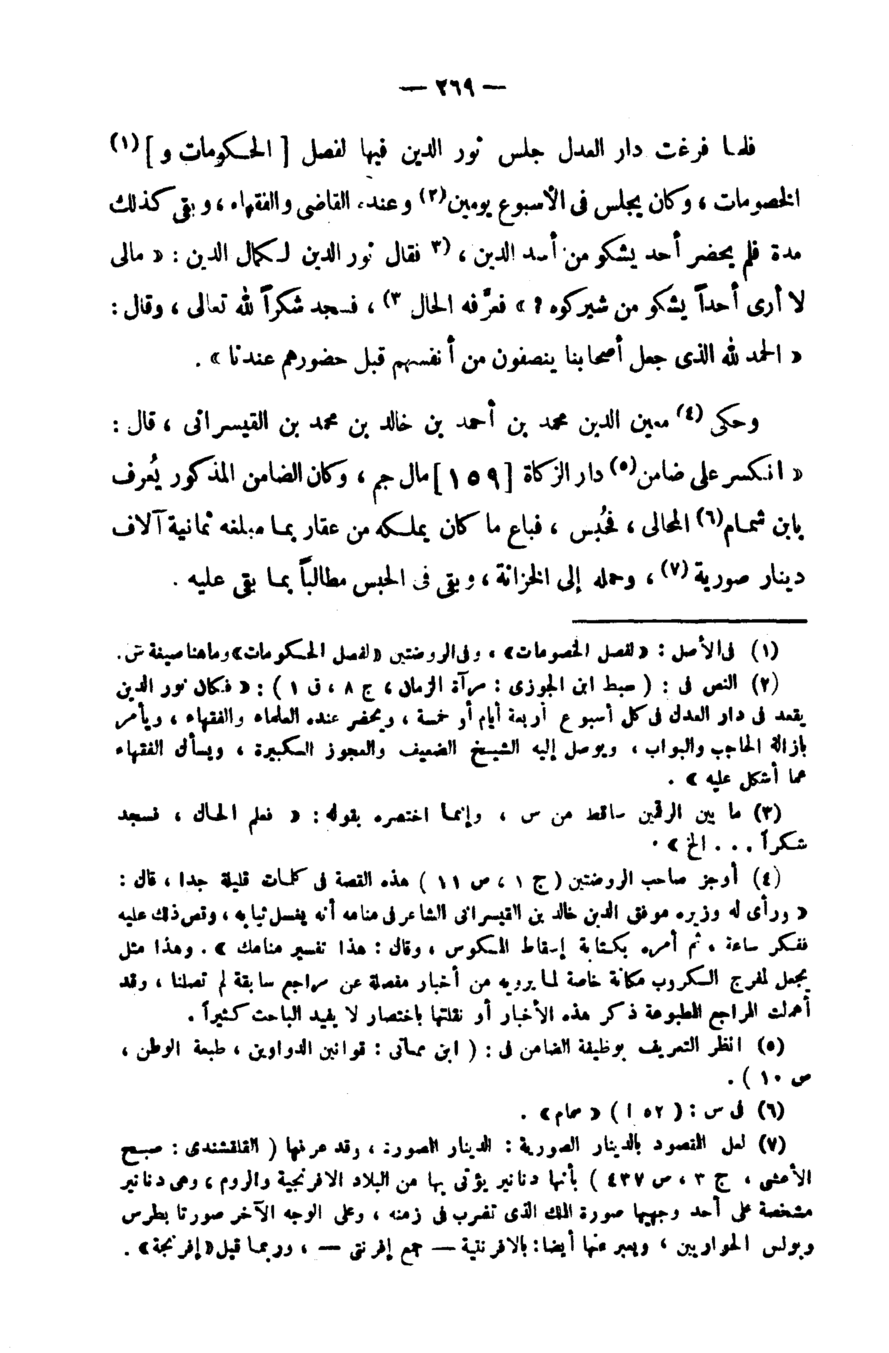 (¬2) النص في: (سبط ابن الجوزى: مرآة الزمان، ج 8، ق 1): «فكان نور الدين يقعد في دار العدل في كل أسبوع أربعة أيام أو خمسة، ويحضر عنده العلماء والفقهاء، ويأمر بازالة الحاجب والبواب، ويوصل إليه الشيخ الضعيف والعجوز الكبيرة، ويسأل الفقهاء عما أشكل عليه».
